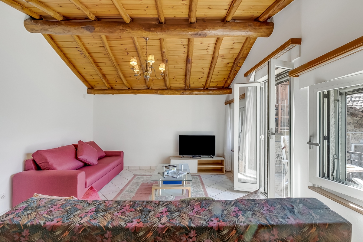 The relaxation room offers a comfortable double sofa-bed and another sofa to enjoy an incredible view of the lake and convivial moments in front of the TV. The relaxation room is equipped with a convenient wardrobe and has access to the outdoor balcony with a small table and two armchairs for a magical moment of peace in a truly special place.