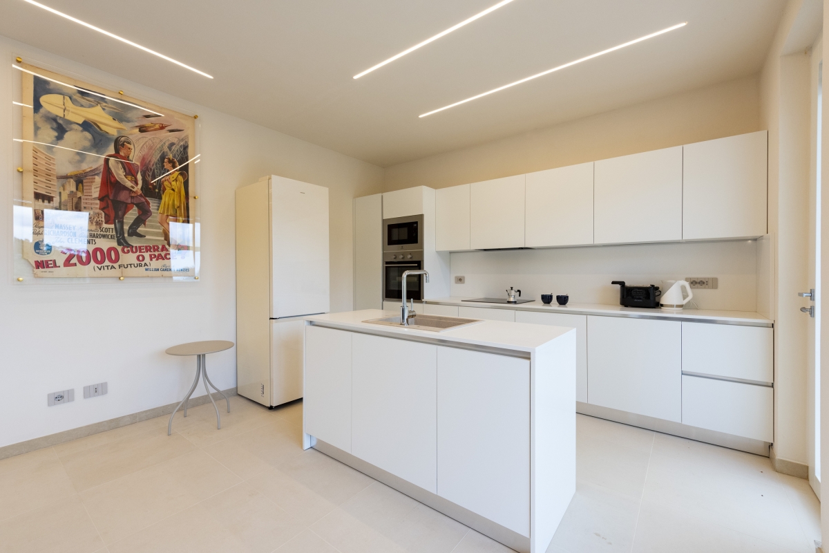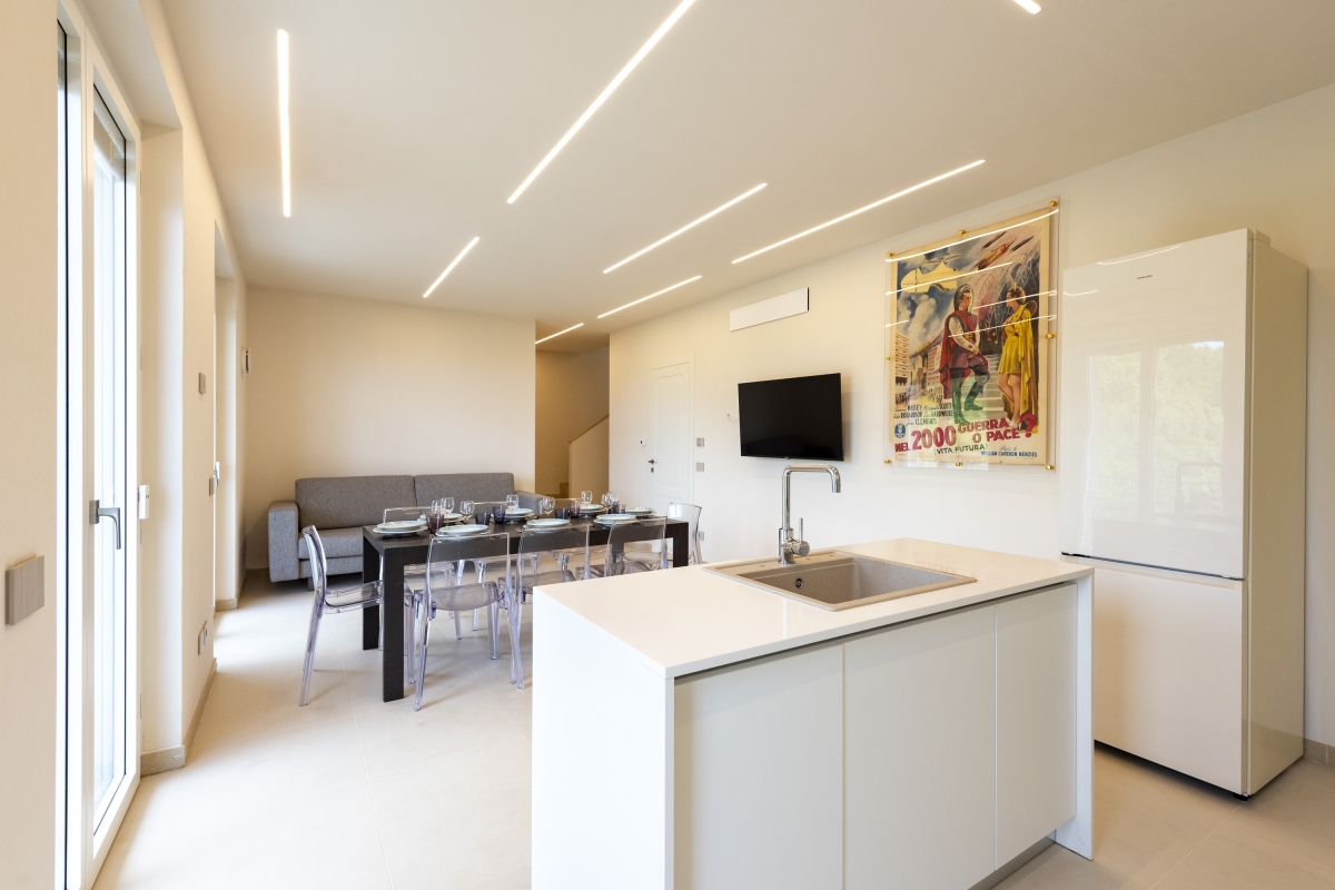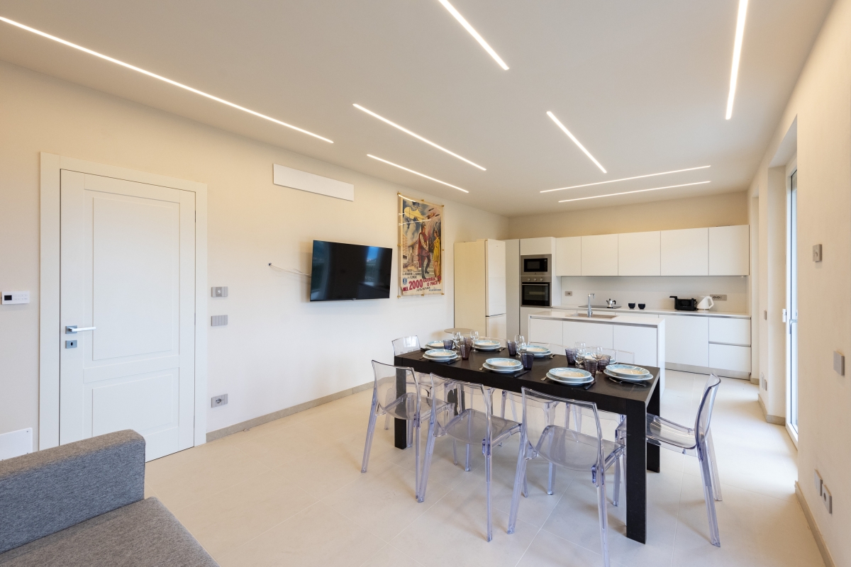 Inside, guests can relax in the open-plan living room, which is furnished with a double sofa, a Smart flatscreen HDTV and a large dining table. This air-conditioned space also incorporates a modern, fully equipped kitchen fitted with a Moka coffee machine, an induction hob, an oven, a microwave, a dishwasher and a fridge freezer.