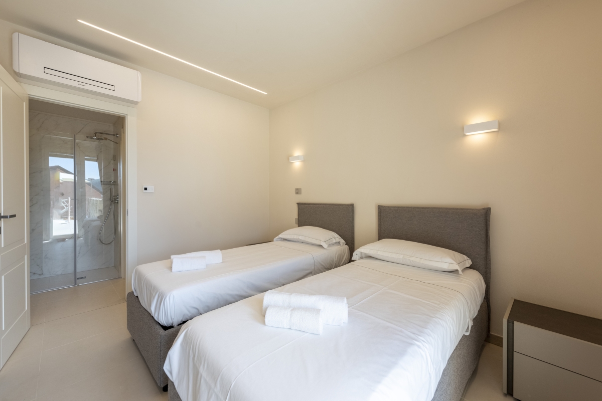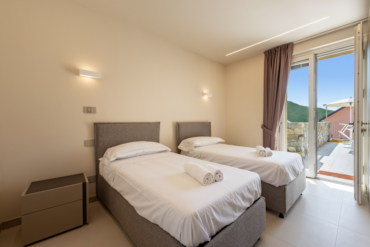 Bedroom 1: The first air-conditioned bedroom is located on the ground floor and is furnished with twin joinable beds and a wardrobe. This room enjoys access to the terrace.