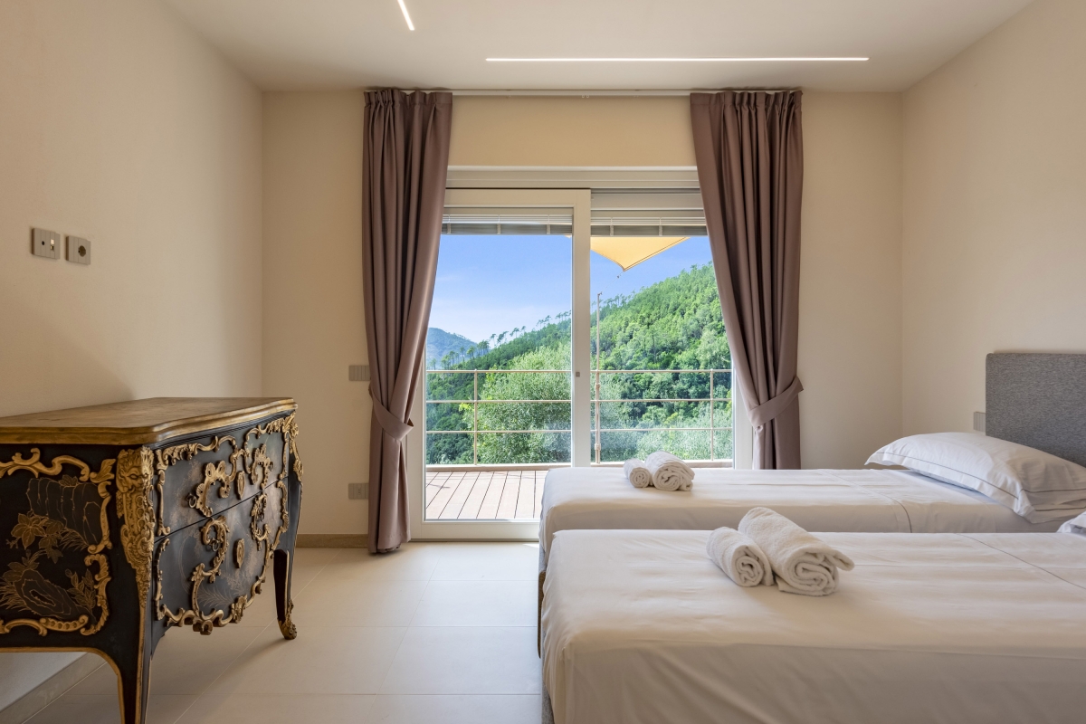 Relais Le Torri apartment is located on the outskirts of the small town of Casarza Ligure, a few kilometres from the Italian Riviera in northwestern Italy. The surrounding countryside is rich in olive oil and wine production, with local trattorias serving traditional Ligurian dishes. The closest restaurants and grocery stores are in the town centre, a 4-minute drive/15-minute walk down the hill.