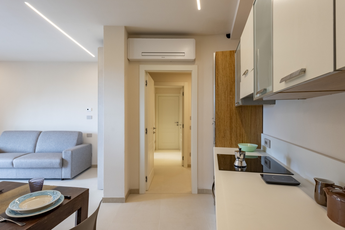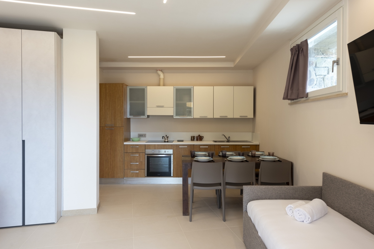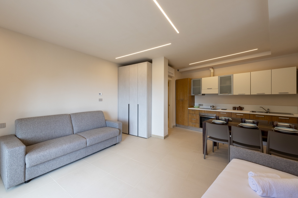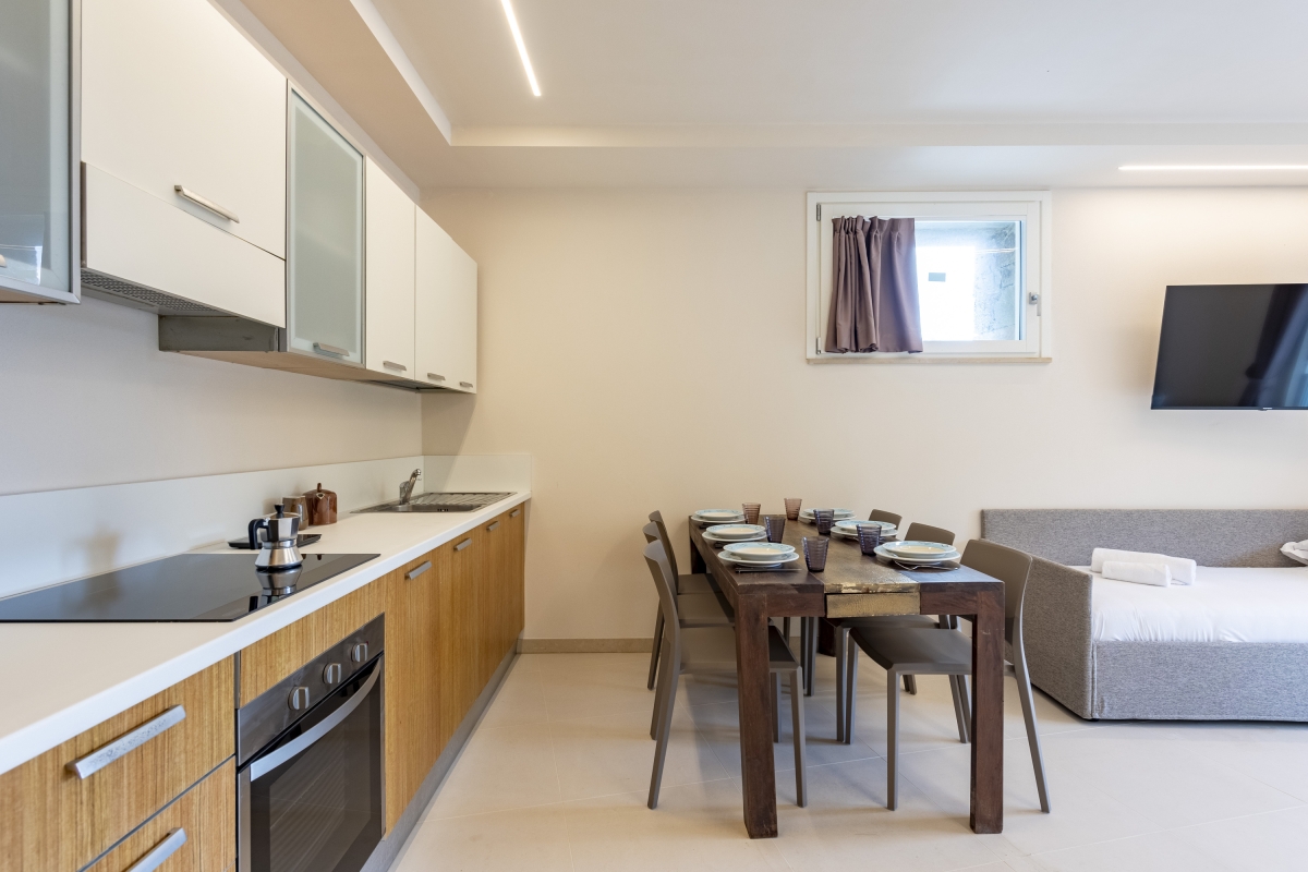 Inside, guests can relax in the spacious open-plan living room, which is furnished with a double sofa bed, a single sofa bed, a Smart flatscreen TV, a wardrobe and a large dining table. This air-conditioned space also incorporates a modern, fully equipped kitchen fitted with a Moka coffee machine, an induction hob, an oven, a microwave and a fridge freezer.
