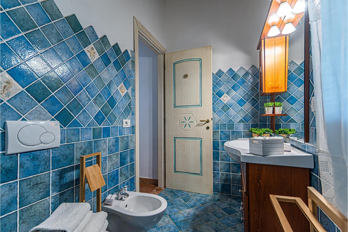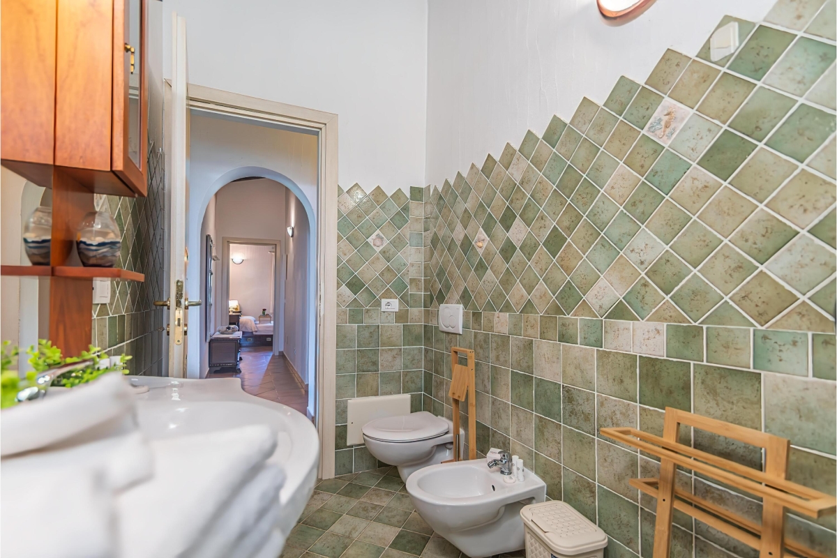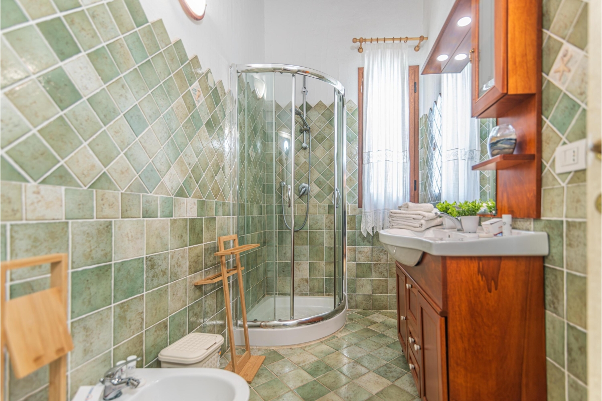Bathroom 2: This separate, brightly tiled bathroom has a shower, basin, bidet and WC.