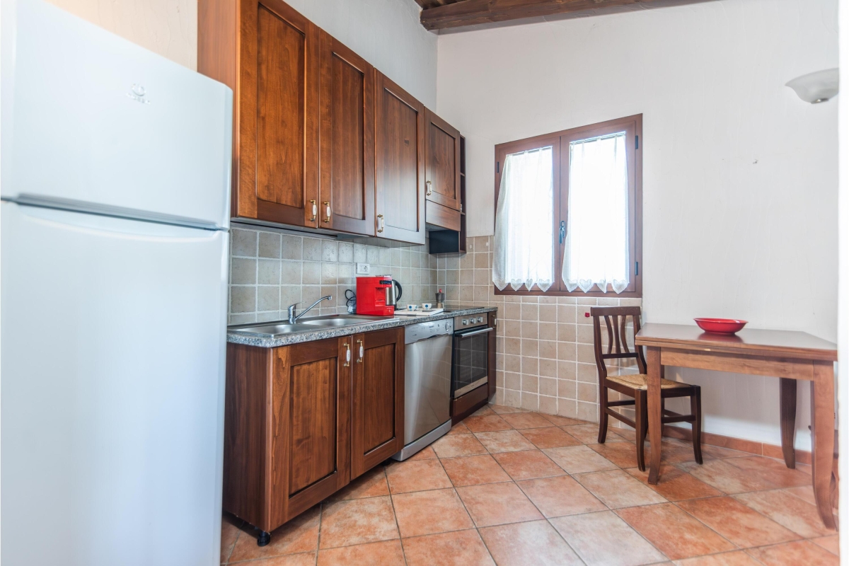 The separate kitchen is accessed via an archway from the living room. It is well-equipped with an induction hob, oven, microwave, dishwasher, an American drip coffee maker and fridge/freezer. There is also a kitchen table and chairs for quick snacks.