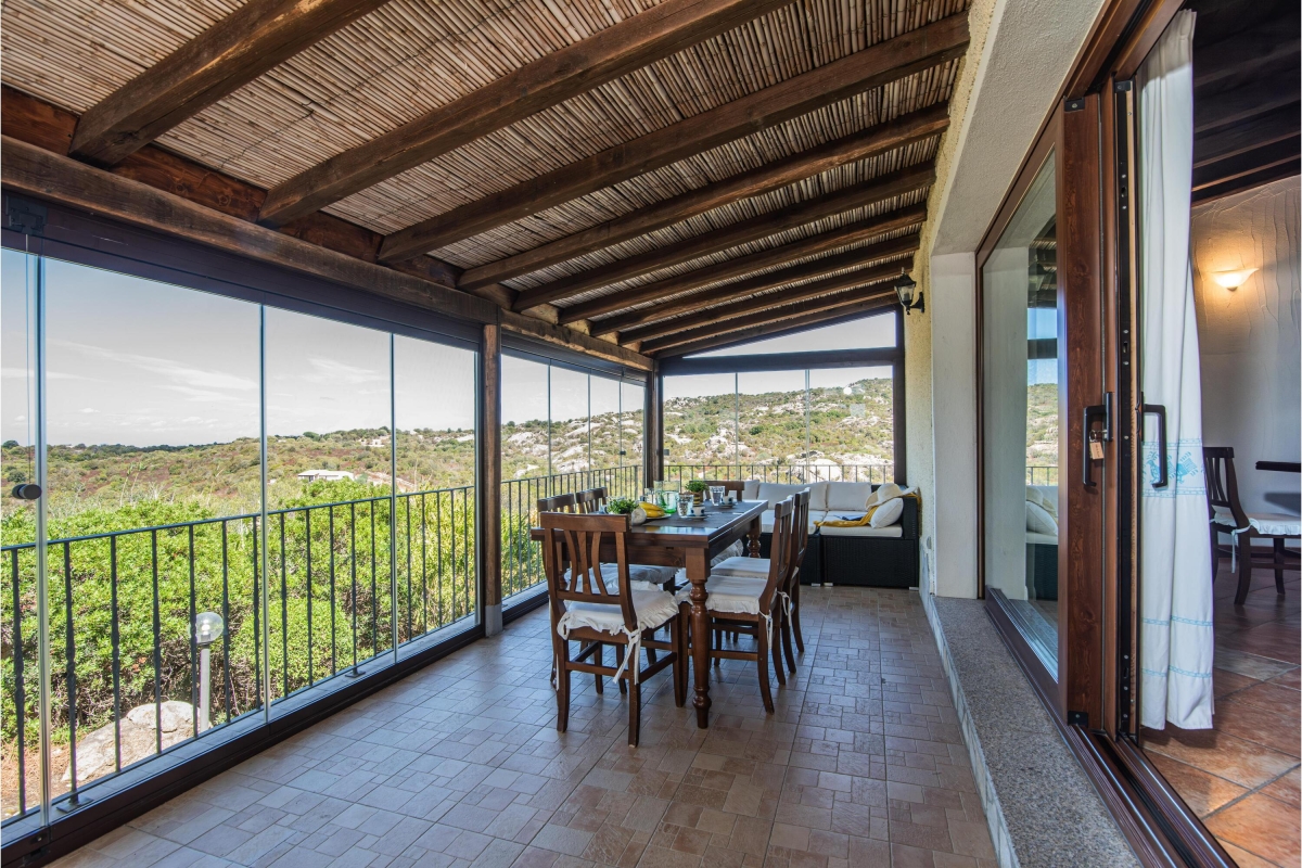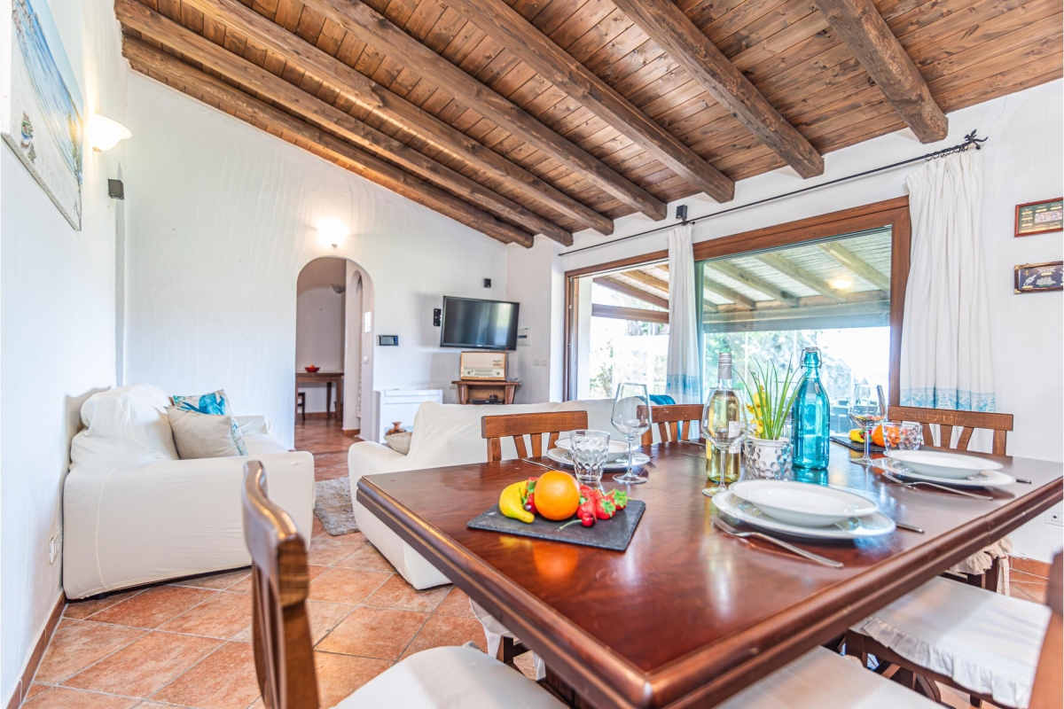 The villa is spread over 1 floor with a spacious living room, complete with wooden beamed ceilings and terracotta floors. This is furnished with two comfortable sofas and a flat-screen TV. The dining area is next to an open fireplace and includes a wooden dining table and chairs. Large glass doors lead out onto a covered veranda with panoramic views. This acts as another living space, as there are two sofas and another dining table for meals semi al fresco.