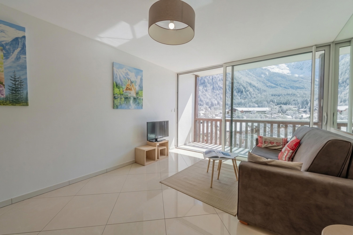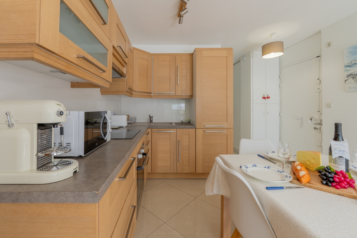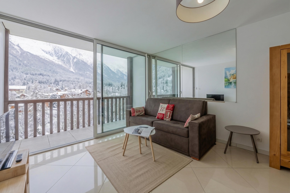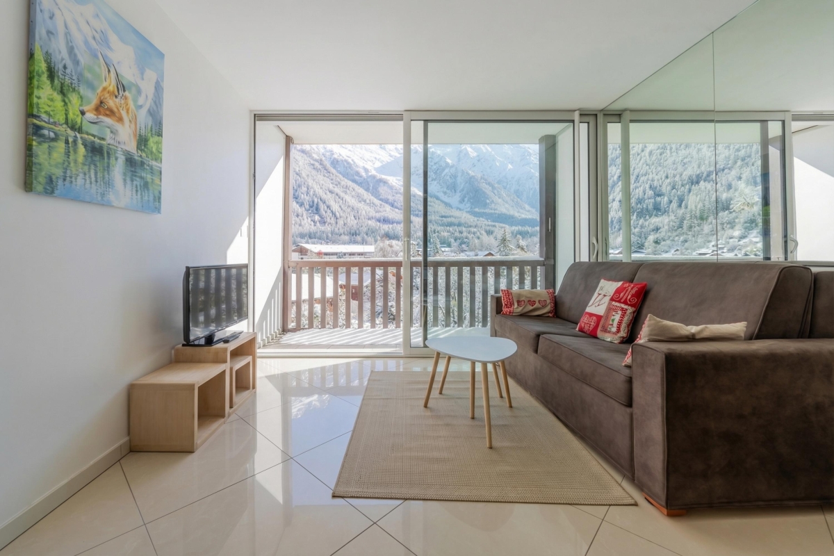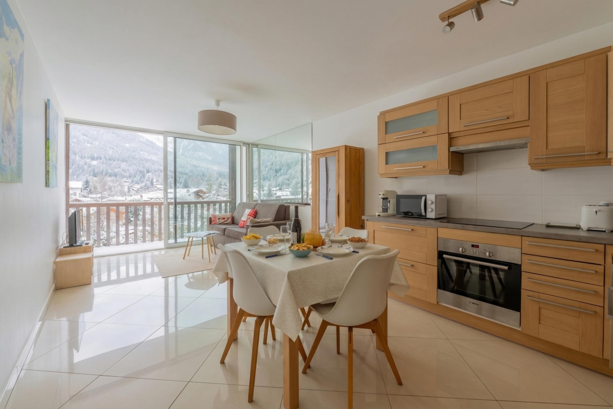 This elegant apartment features a bright open-plan living space, thanks to the large bay window that opens onto the balcony. As its name suggests, it offers panoramic views of the Alps and the Mont Blanc glacier, which you can admire from the deckchairs or around a folding dining table. The interior is furnished with a comfortable sofa and a flat-screen TV. A pine dining table and chairs sit next to the open-plan kitchen. The kitchen is well equipped with an induction hob, oven, microwave, refrigerator, and Nespresso coffee machine.
