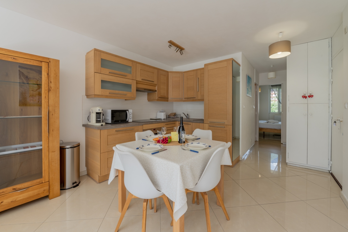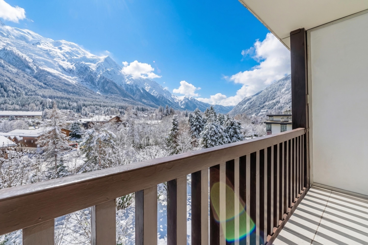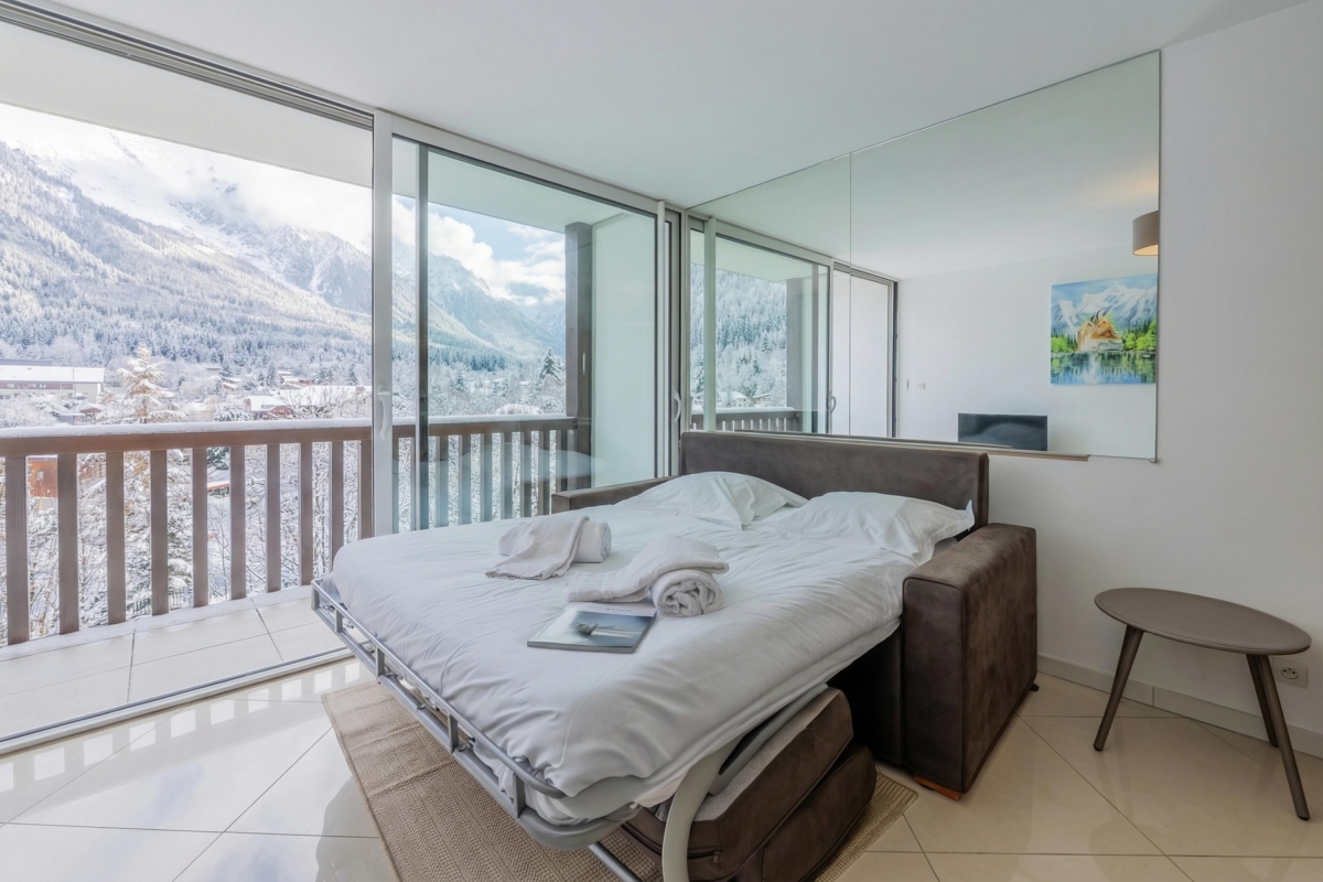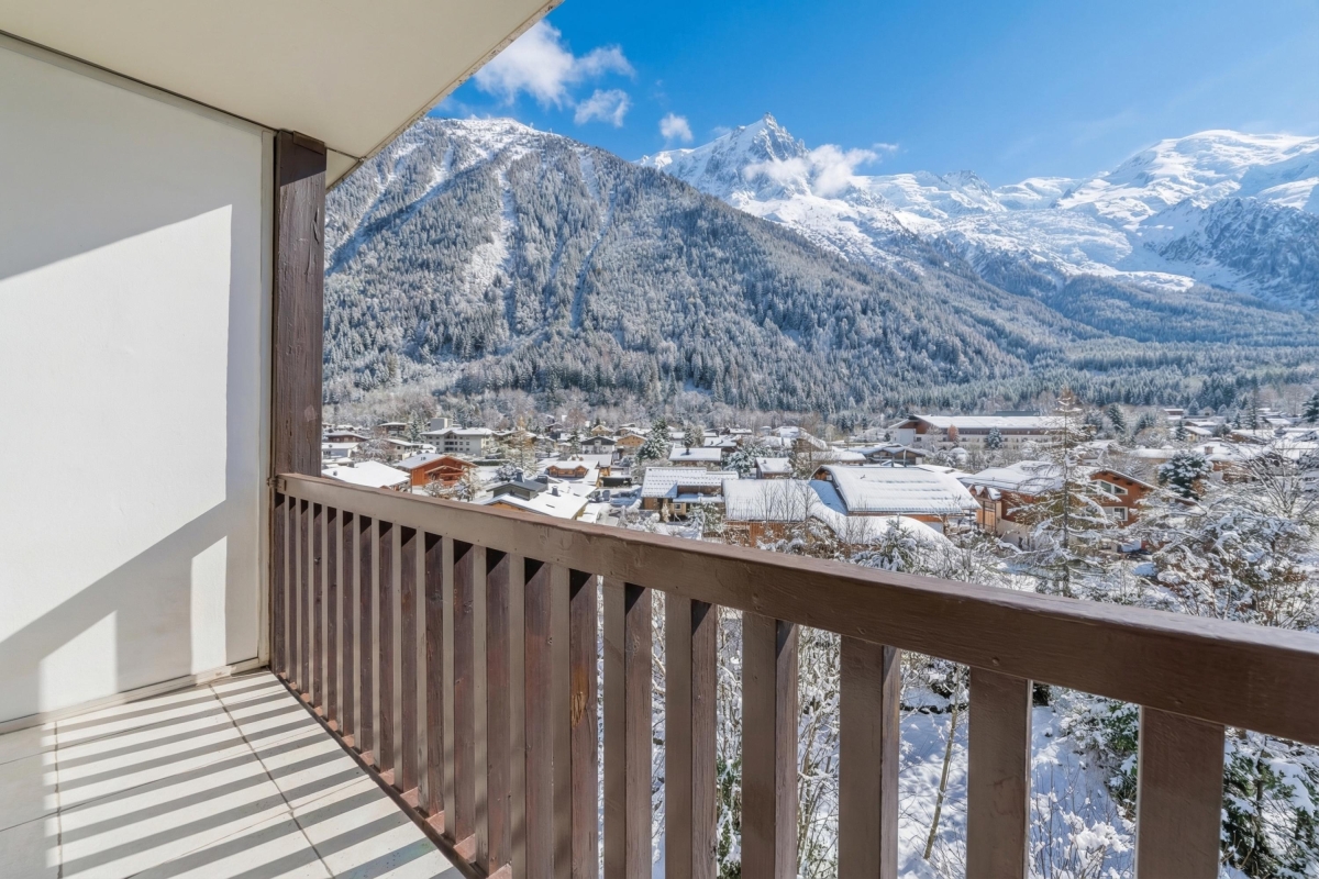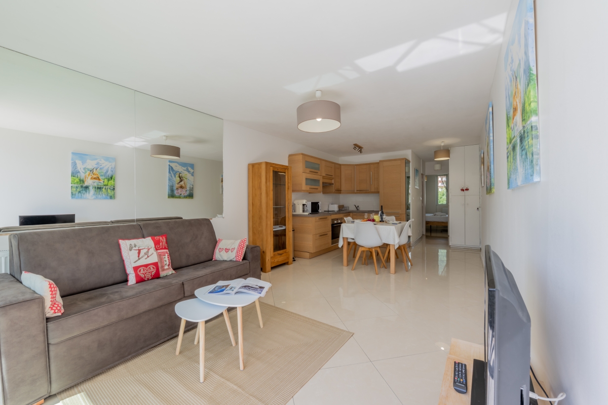 This elegant apartment features a bright open-plan living space, thanks to the large bay window that opens onto the balcony. As its name suggests, it offers panoramic views of the Alps and the Mont Blanc glacier, which you can admire from the deckchairs or around a folding dining table. The interior is furnished with a comfortable sofa and a flat-screen TV. A pine dining table and chairs sit next to the open-plan kitchen. The kitchen is well equipped with an induction hob, oven, microwave, refrigerator, and Nespresso coffee machine.
