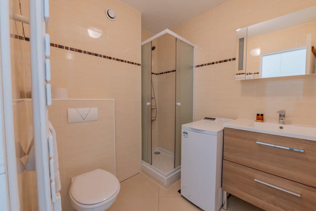 The tiled bathroom has a glass shower with a basin, washing machine and WC.
