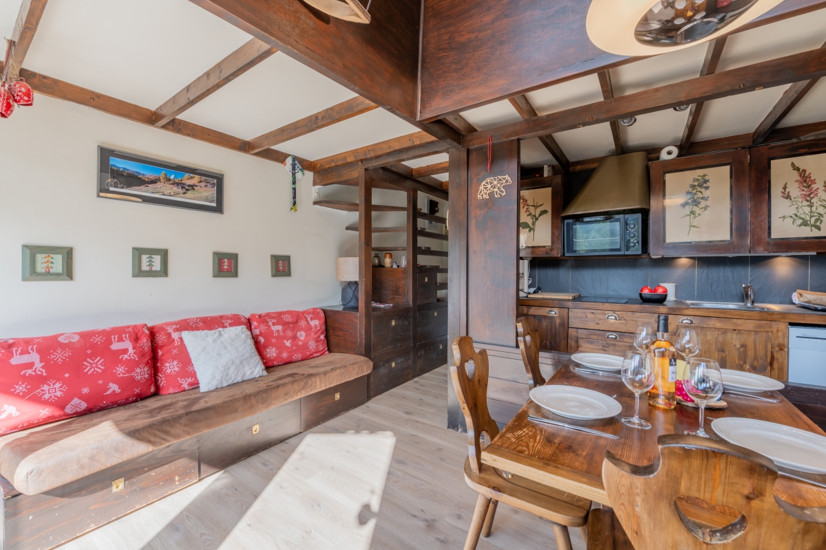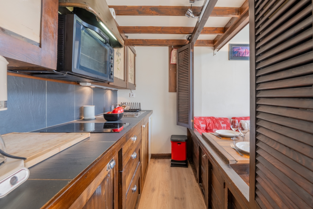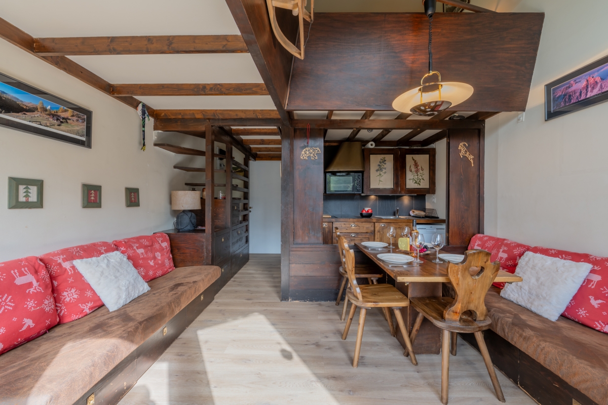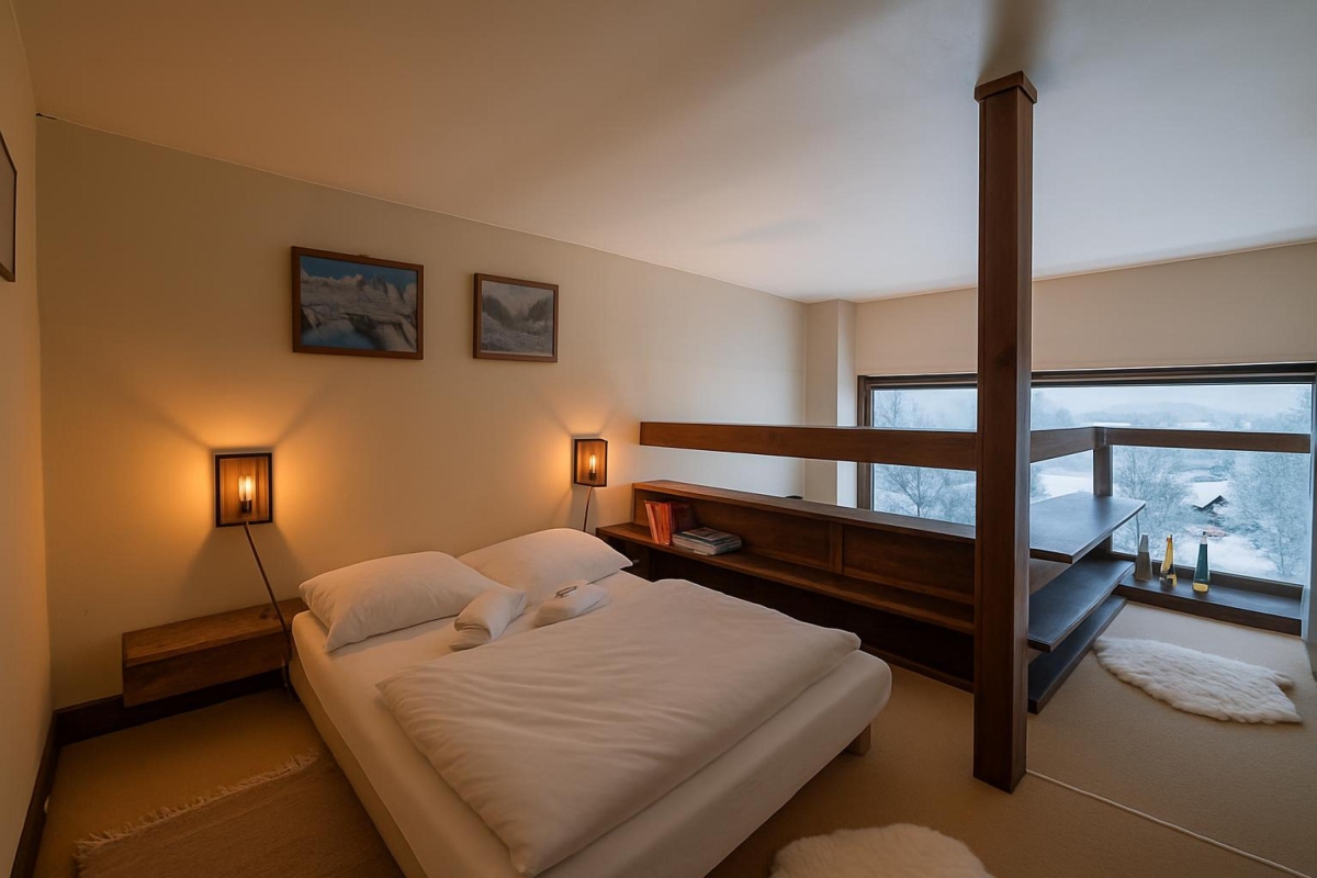 Inside, the apartment welcomes up to three guests with one comfortable bedroom and a bright living room that opens onto a south-facing balcony with sweeping mountain views. Both the living area and balcony are bathed in natural light—ideal for stretching out and literally bathing in the sun—while the living room also frames lovely green and mountain vistas from indoors. The compact kitchen is well-appointed for self-catering, featuring an induction hob, coffee machine, dishwasher, oven and fridge with freezer. Cozy, practical and perfectly placed, Bruyères 213 is an inviting alpine base for couples, small families, or friends seeking effortless access to Chamonix’s slopes and scenery.