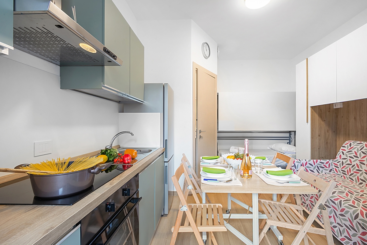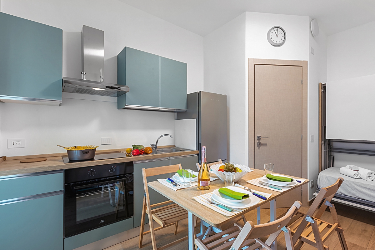 The apartment is on the ground floor and features a single open-plan living space, furnished with a double sofa bed, flat-screen TV, dining table and a fully equipped kitchenette. The kitchen includes an induction hob, oven and fridge/freezer.