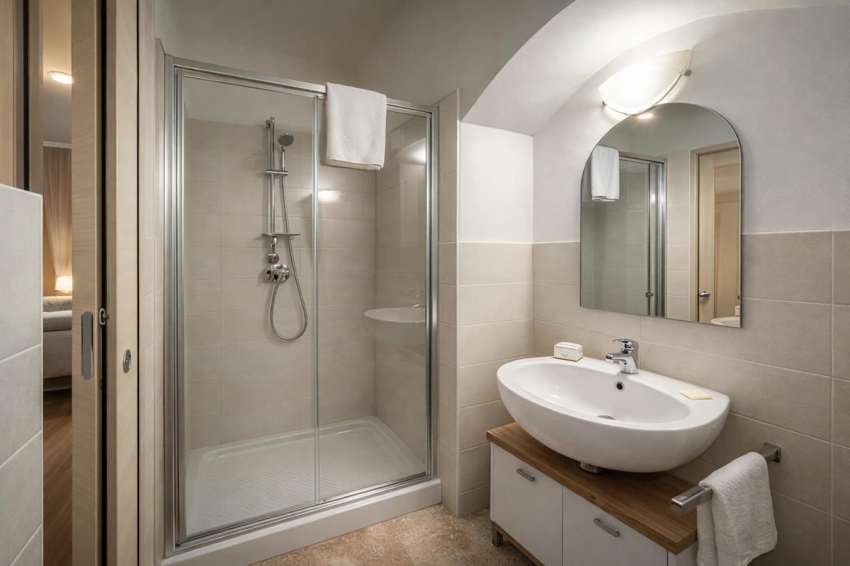 Bathroom: A clean, modern bathroom with a walk-in shower and a washing machine for your convenience.