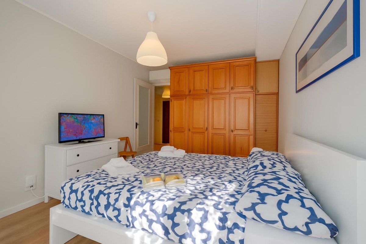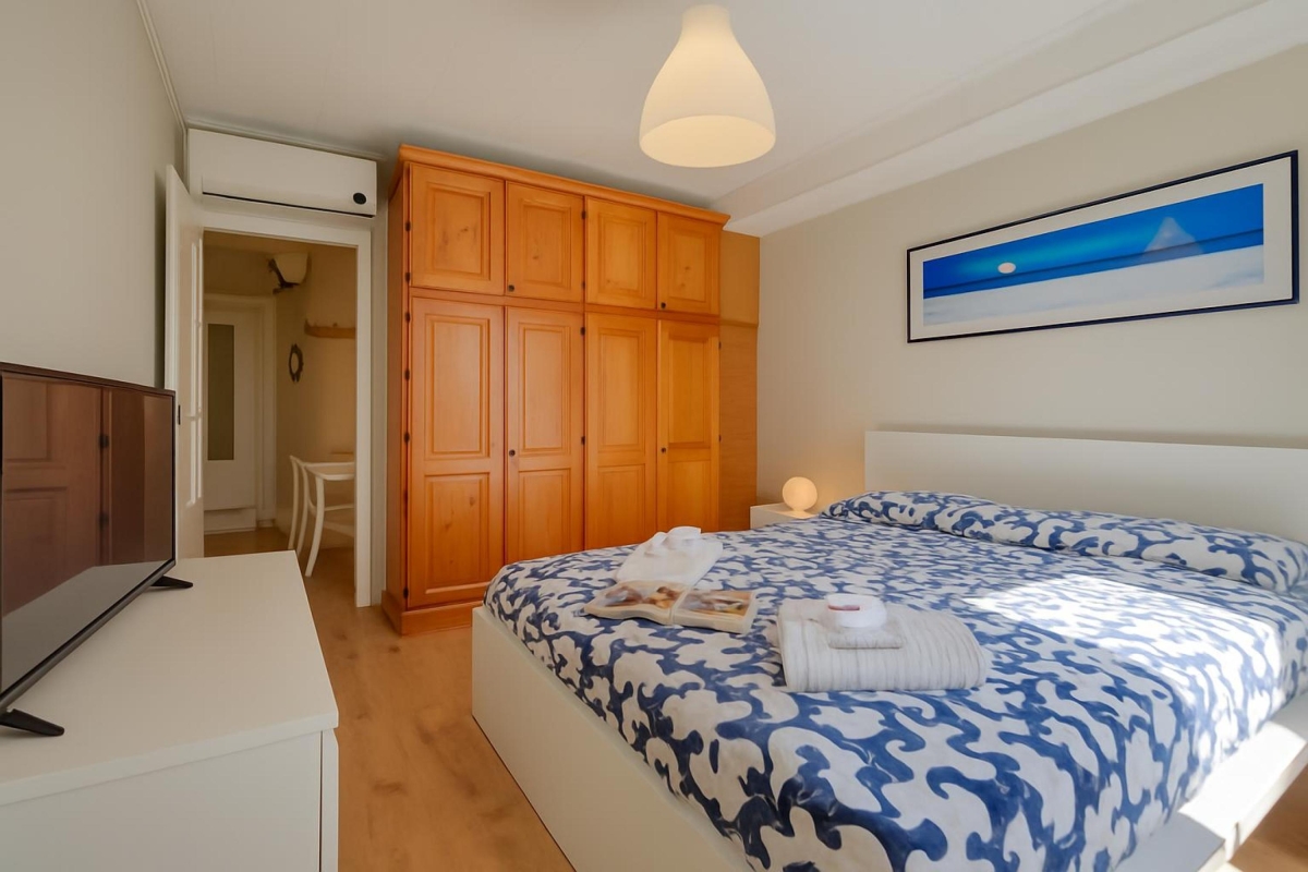 Bedroom: The bedroom has a double bed, a flatscreen TV and extensive wardrobes.