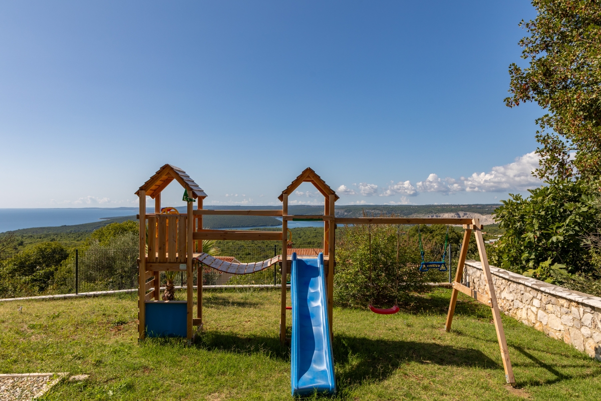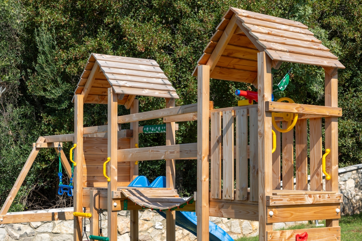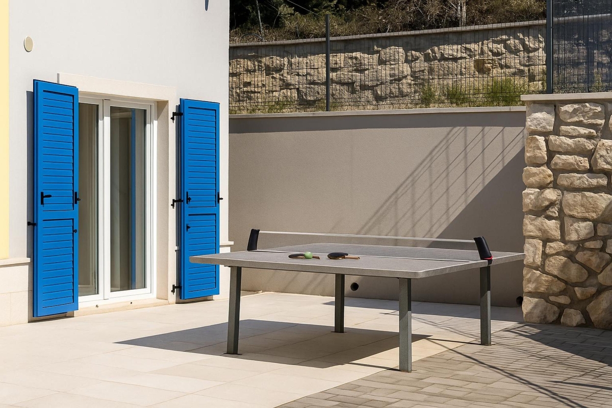 The outdoor experience is the villa’s heart: a private pool surrounded by eight comfortable sun loungers and broad terraces perfect for morning coffee or evening gatherings. A large outdoor stone fireplace and barbecue make Mediterranean-style cooking effortless, while a well-equipped kitchen inside—featuring a cooker hob, coffee machine, electric kettle, microwave, oven, toaster, dishwasher, and fridge with freezer—ensures everything you need for effortless self-catering. Families and groups will appreciate the recreational offerings too: billiards, table tennis, a children’s playground, and plenty of space for relaxed socialising.
