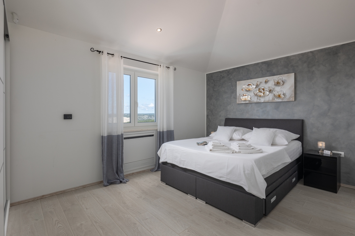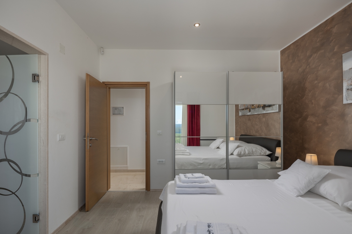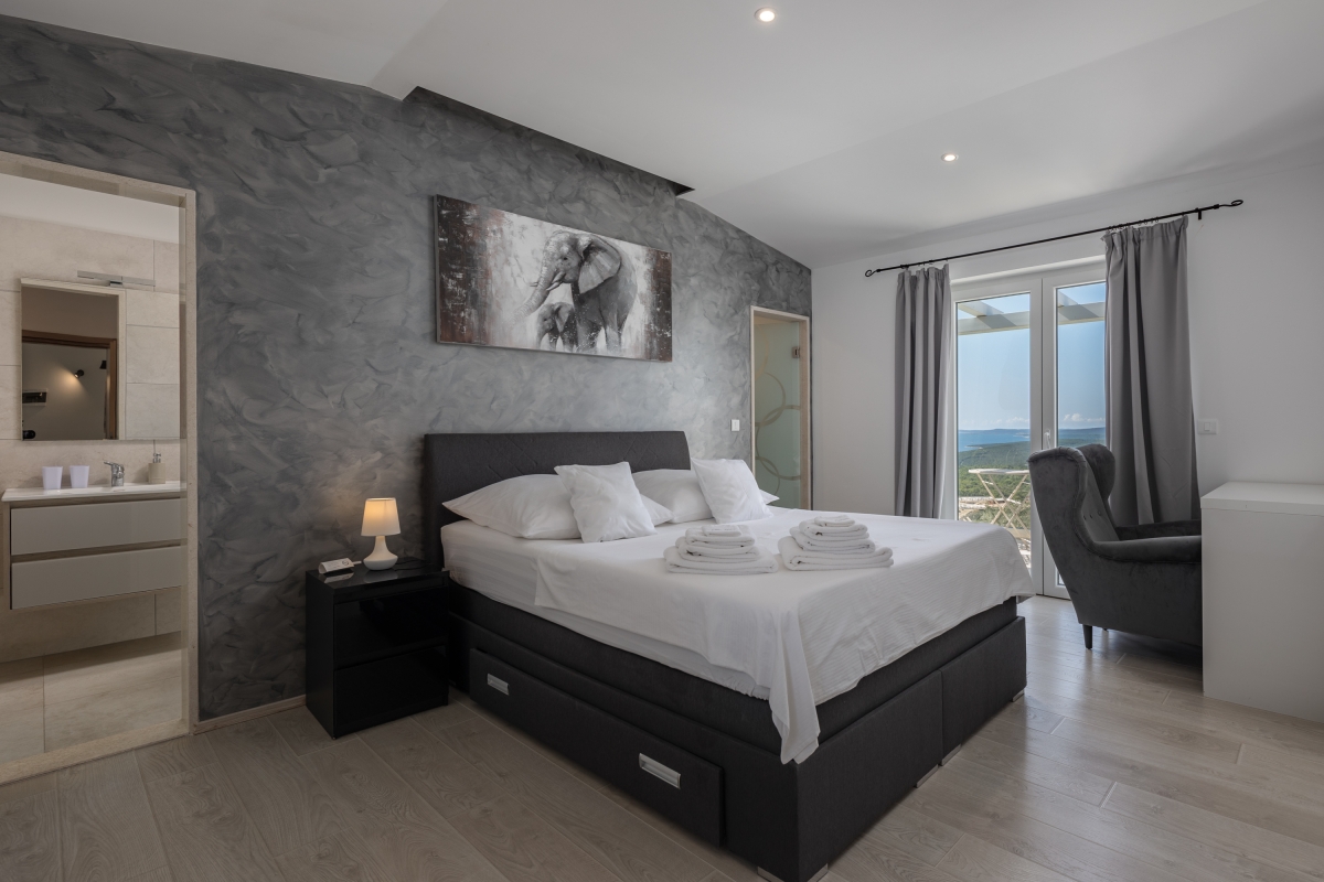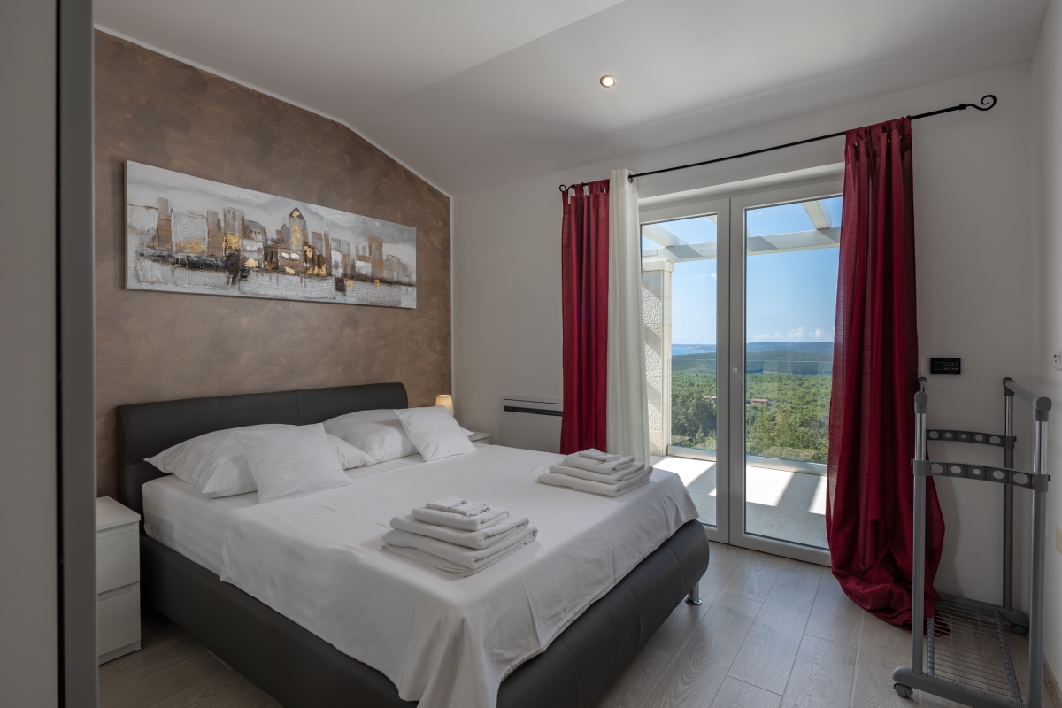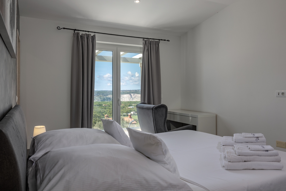 This holiday home is an elegant, ground-floor retreat that comfortably sleeps eight across four beautifully appointed bedrooms. Nestled in the peaceful village of Viškovići, the villa marries modern design with full comfort, set amid the lush greenery of southeastern Istria. Wake to stunning sea (and coastal/lake) views from many vantage points around the property, and enjoy leisurely meals in the garden or at the dedicated outside dining area that invites alfresco living.