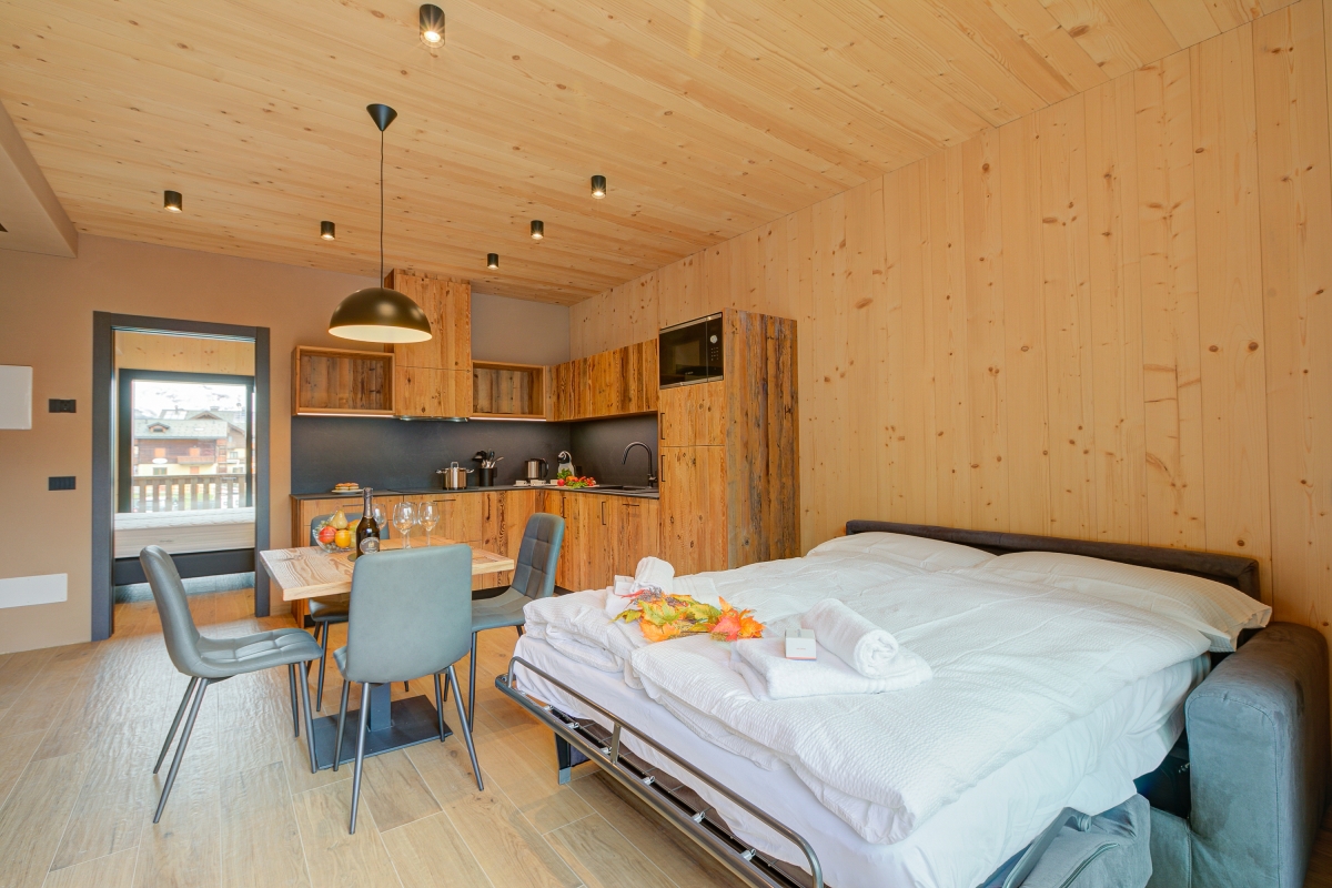 Inside, there is plenty of space to relax after a day on the slopes. The open-plan living space incorporates a well-equipped kitchen and is comfortably furnished with a sofa bed, a dining table and a wall-mounted Smart satellite TV. The modern kitchen is fitted with a Dolce Gusto coffee machine, an induction hob, a microwave, a dishwasher and a fridge freezer.