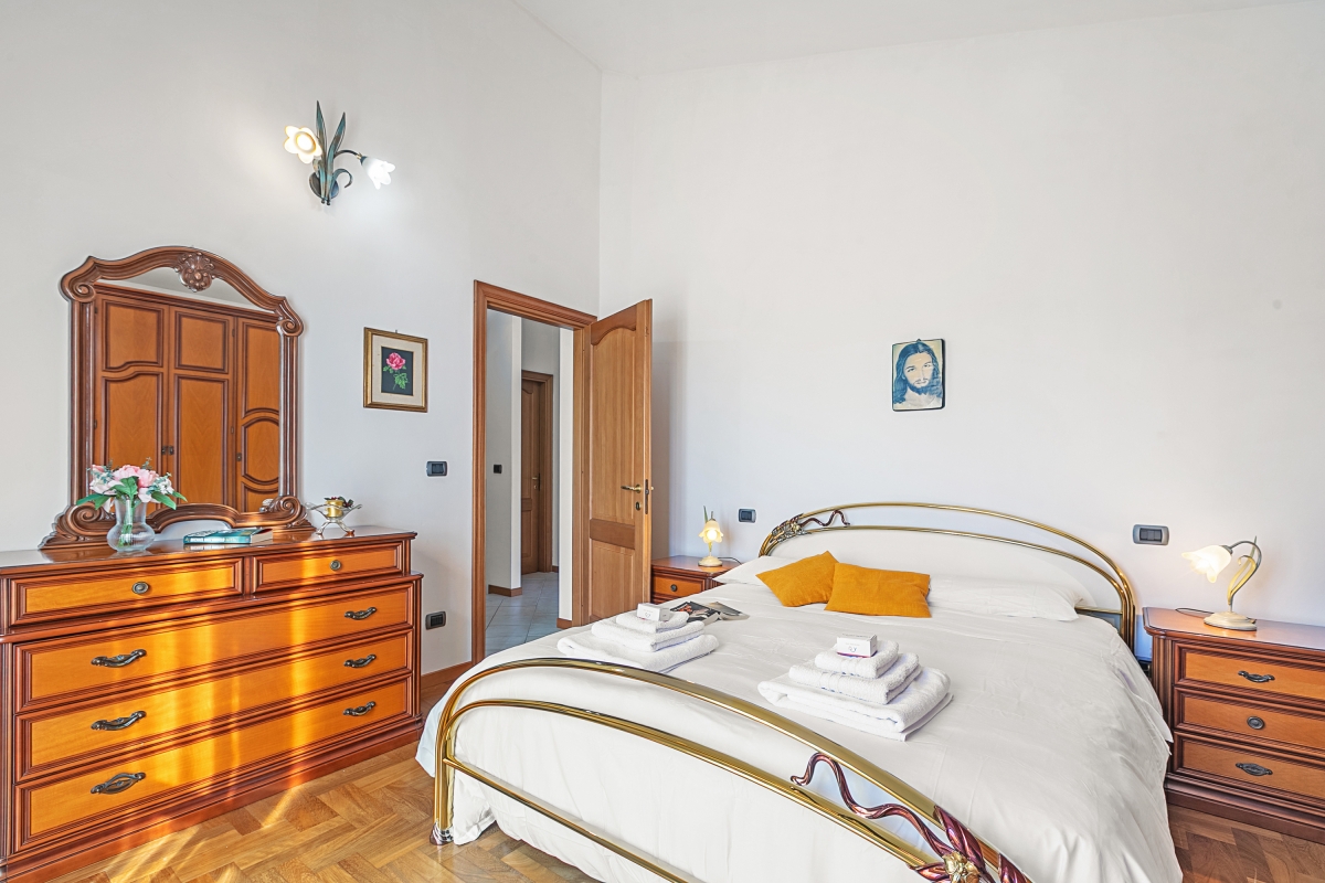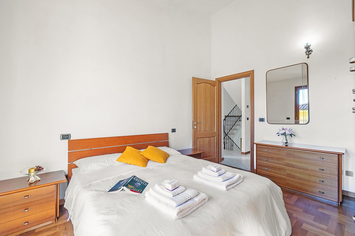 Bedroom 1 on the second floor: Double bedroom with wardrobe, bedside tables, fan, access to the balcony.