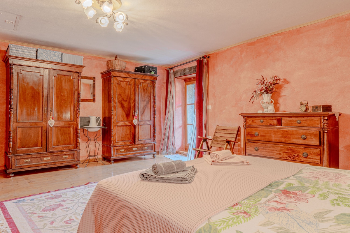 Bedroom 1: The spacious first bedroom features a private balcony and is furnished with a double bed, a chest of drawers and two wardrobes.