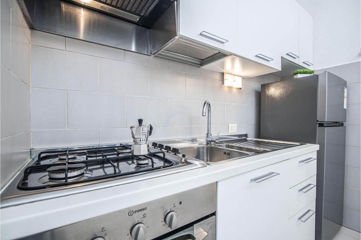 The separate kitchen is equipped with an induction hob, oven, dishwasher, Moka coffee maker and fridge/freezer.
