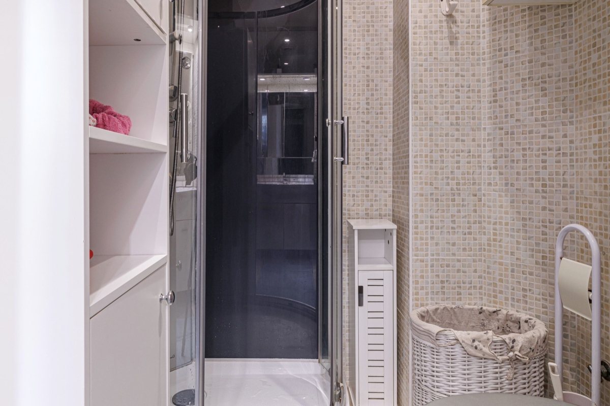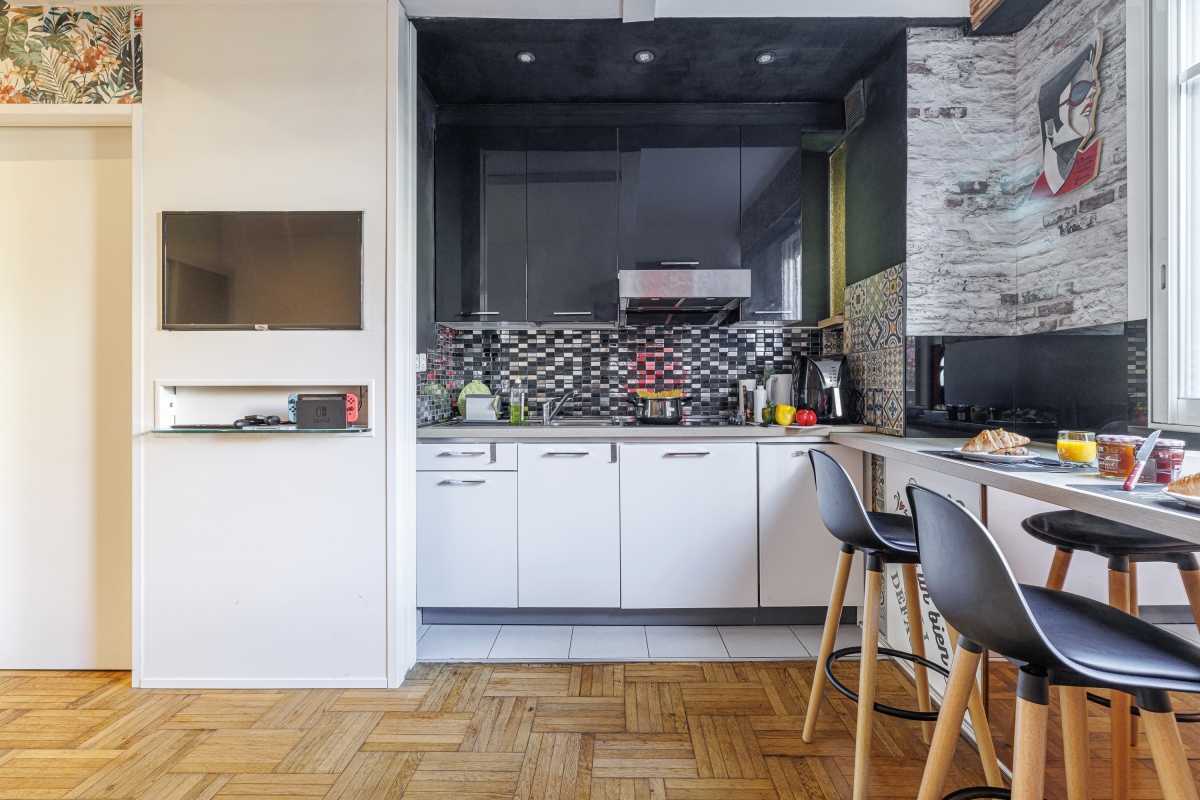 The apartment is full of light, with a parquet floor and modern furnishings. The corner kitchen is equipped with an induction hob, microwave, dishwasher, fridge/freezer and a Nespresso coffee machine. There are two high stools at the breakfast bar for meals. The seating area includes a sofa, flat-screen TV, extensive wardrobes and a fan.