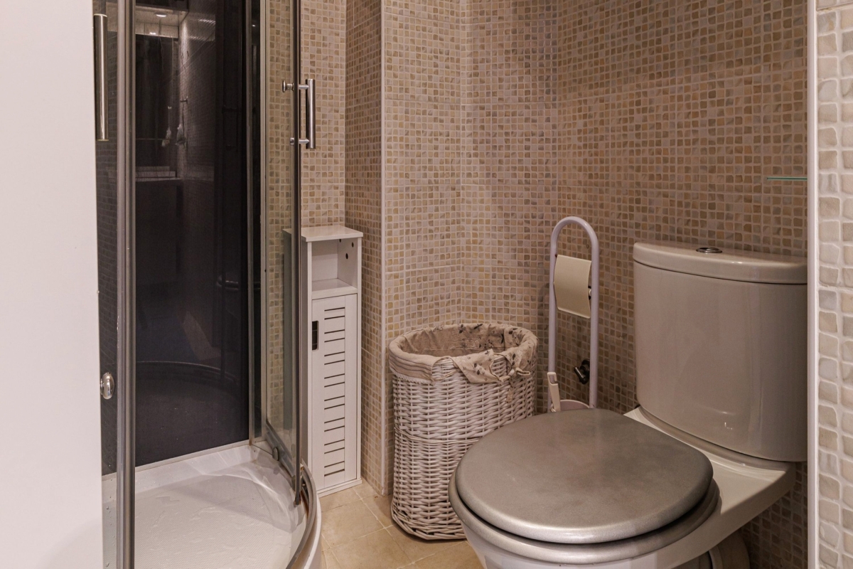 The neat bathroom is fitted with a walk-in shower, a washbasin and a WC