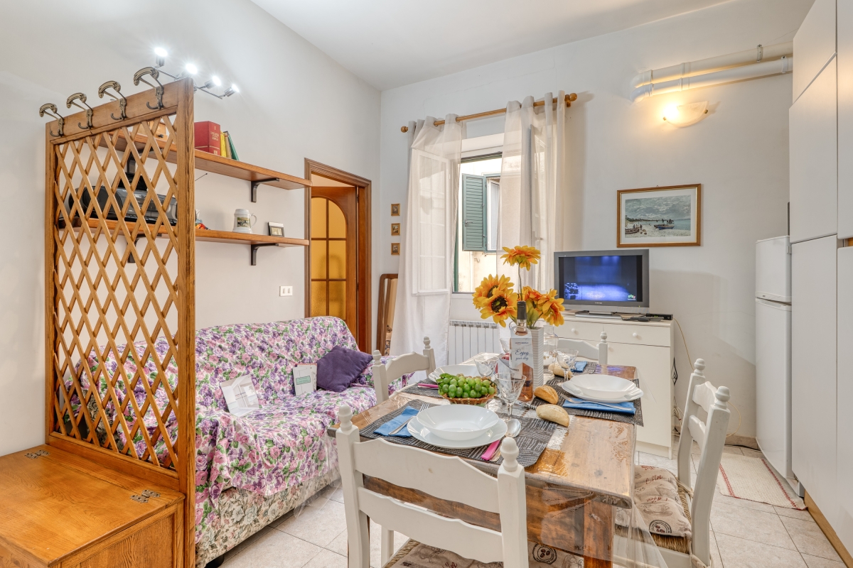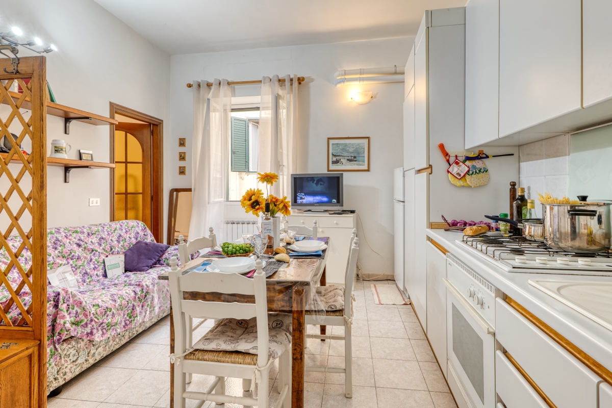 The accommodation features a living room with an open-plan kitchen, furnished with a dining table and chairs. The kitchen is fully equipped with a gas stove, oven, microwave, Moka coffee maker, and fridge with freezer.