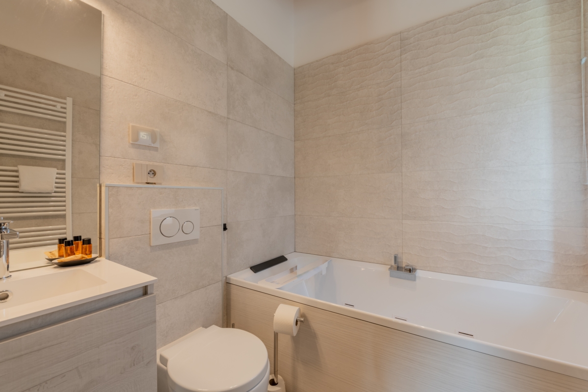 All bathrooms are en-suite. Three feature walk-in showers, while the fourth (connected to Bedroom 2) includes a full bathtub. Each bathroom is equipped with a washbasin and WC. An additional independent WC is located on the ground floor.