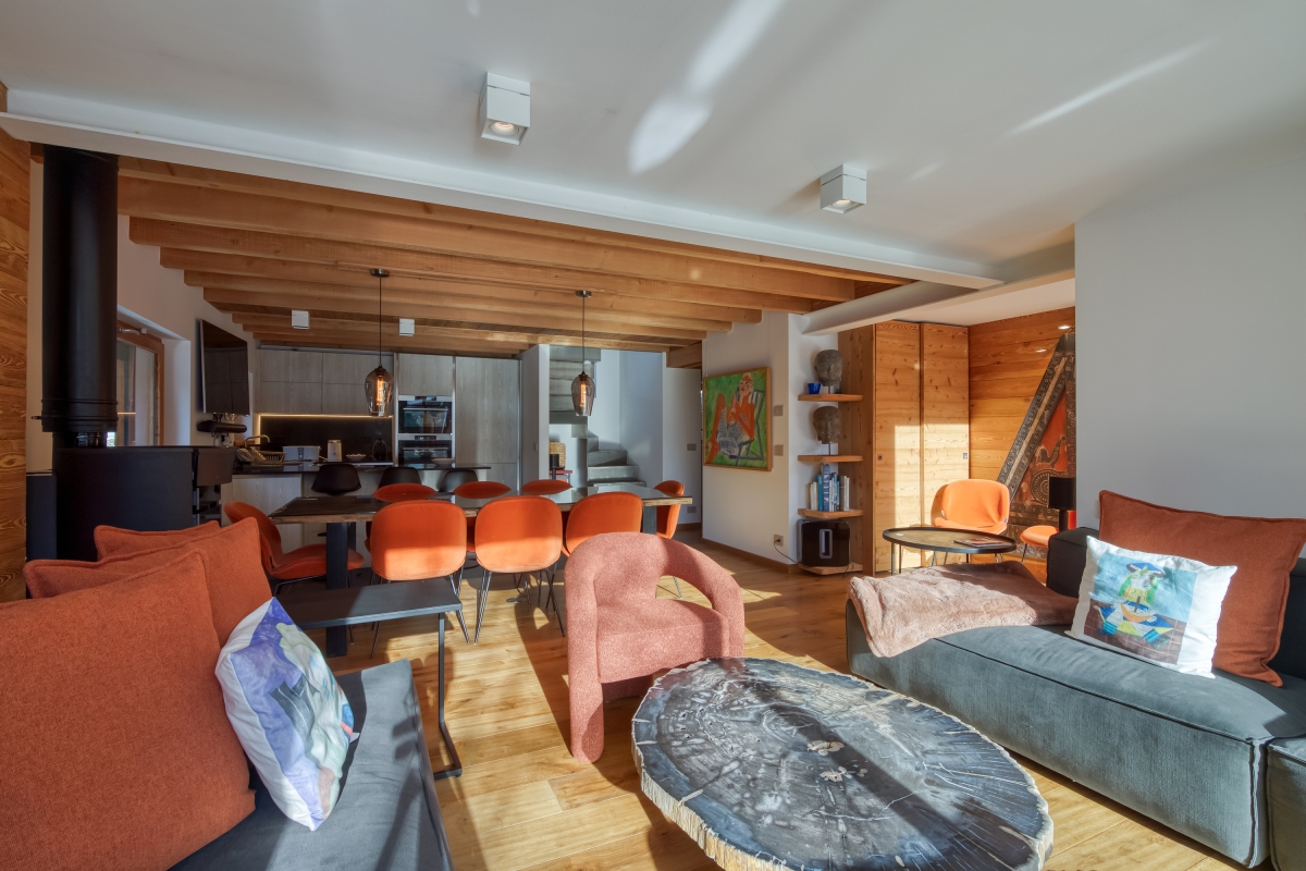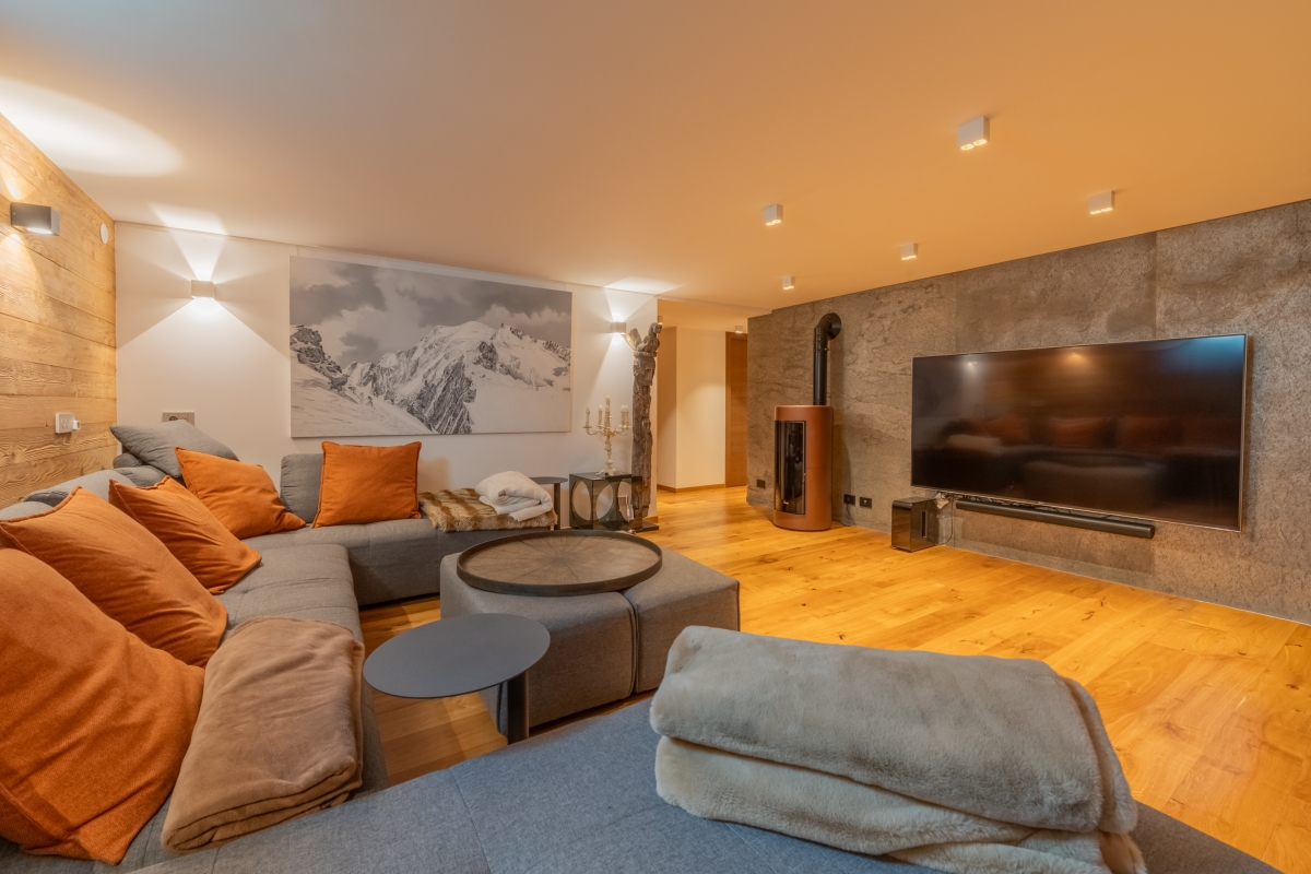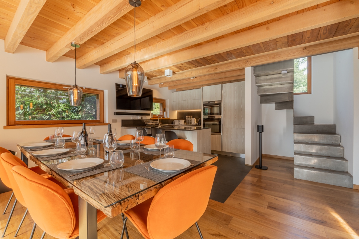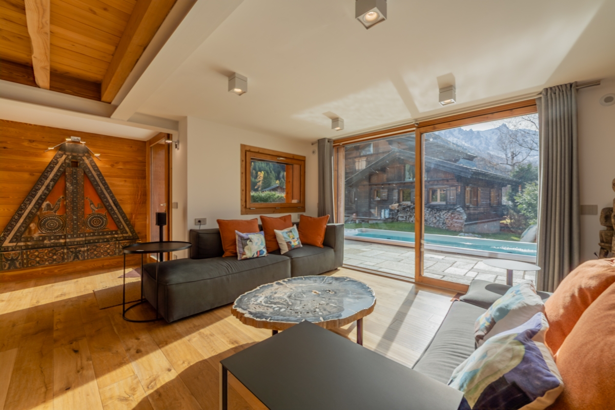Nestled in the beautiful countryside of Argentière, the chalet boasts breathtaking panoramic mountain views. Spread over three levels, it combines contemporary design with warm alpine wooden touches, creating a welcoming and refined atmosphere. The open-plan living area features an elegant lounge with two sofas, a wood-burning stove, and large picture windows opening onto the terrace and the pool. Several outdoor seating areas have been arranged around the heated pool, allowing guests to fully enjoy the spectacular surroundings.