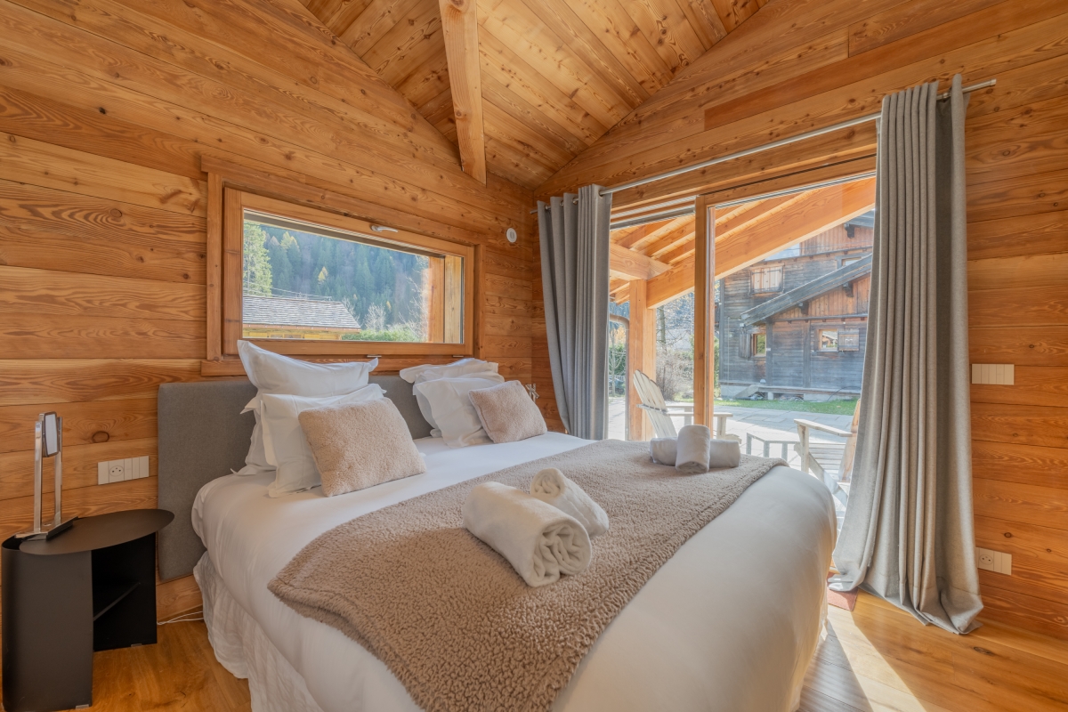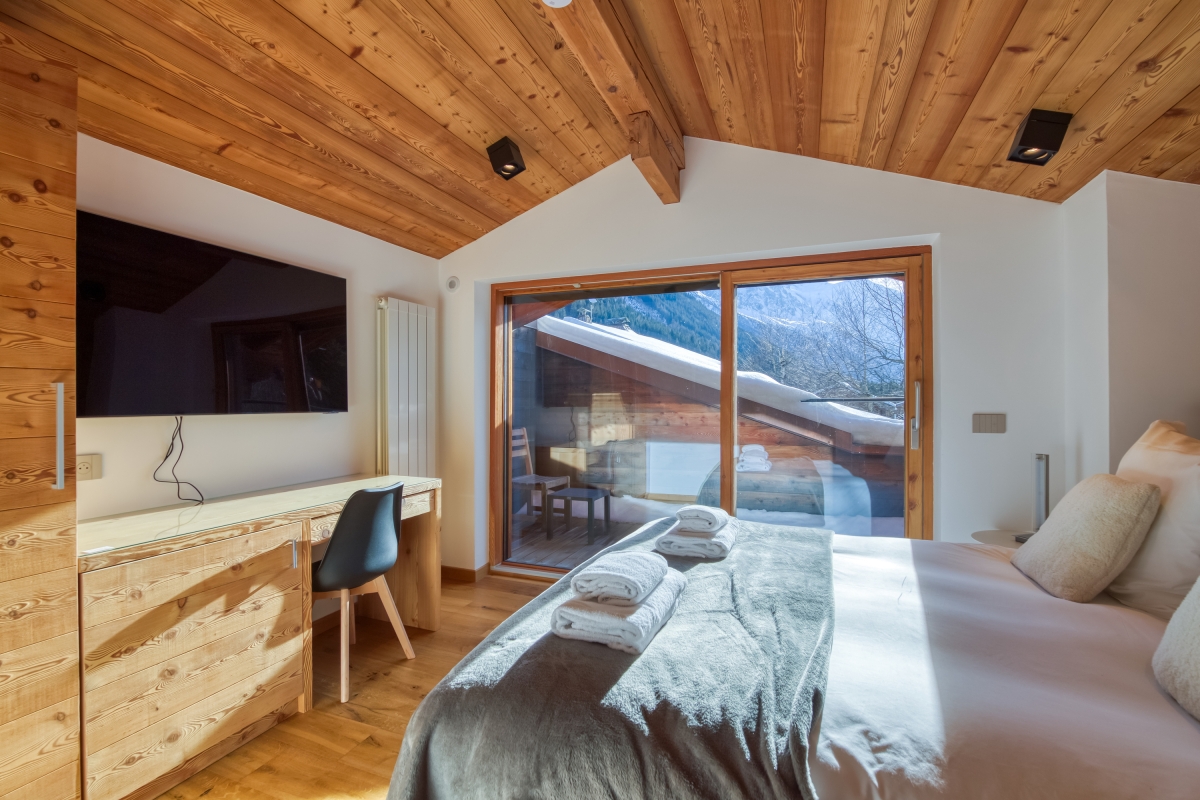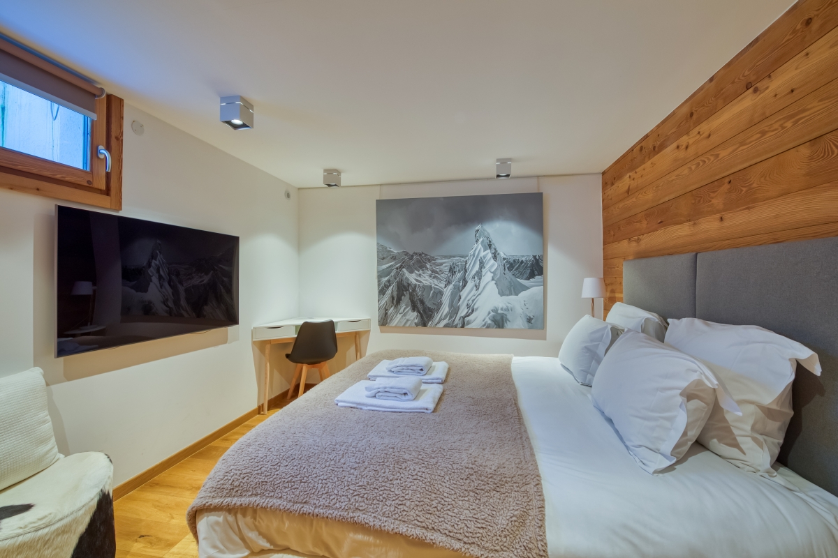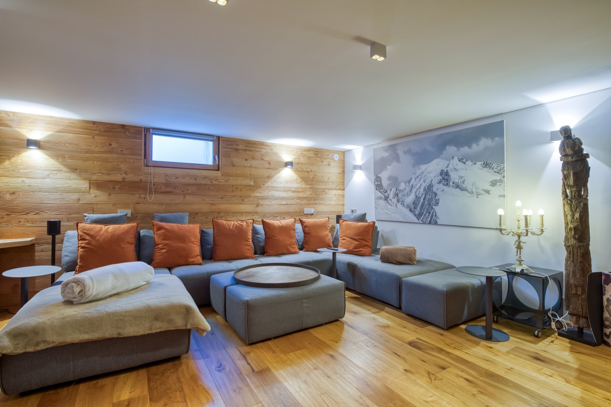 Nestled in the beautiful countryside of Argentière, the chalet boasts breathtaking panoramic mountain views. Spread over three levels, it combines contemporary design with warm alpine wooden touches, creating a welcoming and refined atmosphere. The open-plan living area features an elegant lounge with two sofas, a wood-burning stove, and large picture windows opening onto the terrace and the pool. Several outdoor seating areas have been arranged around the heated pool, allowing guests to fully enjoy the spectacular surroundings.
