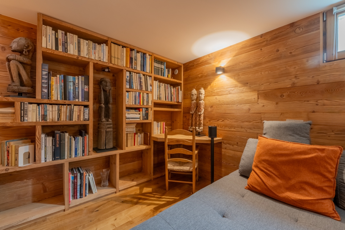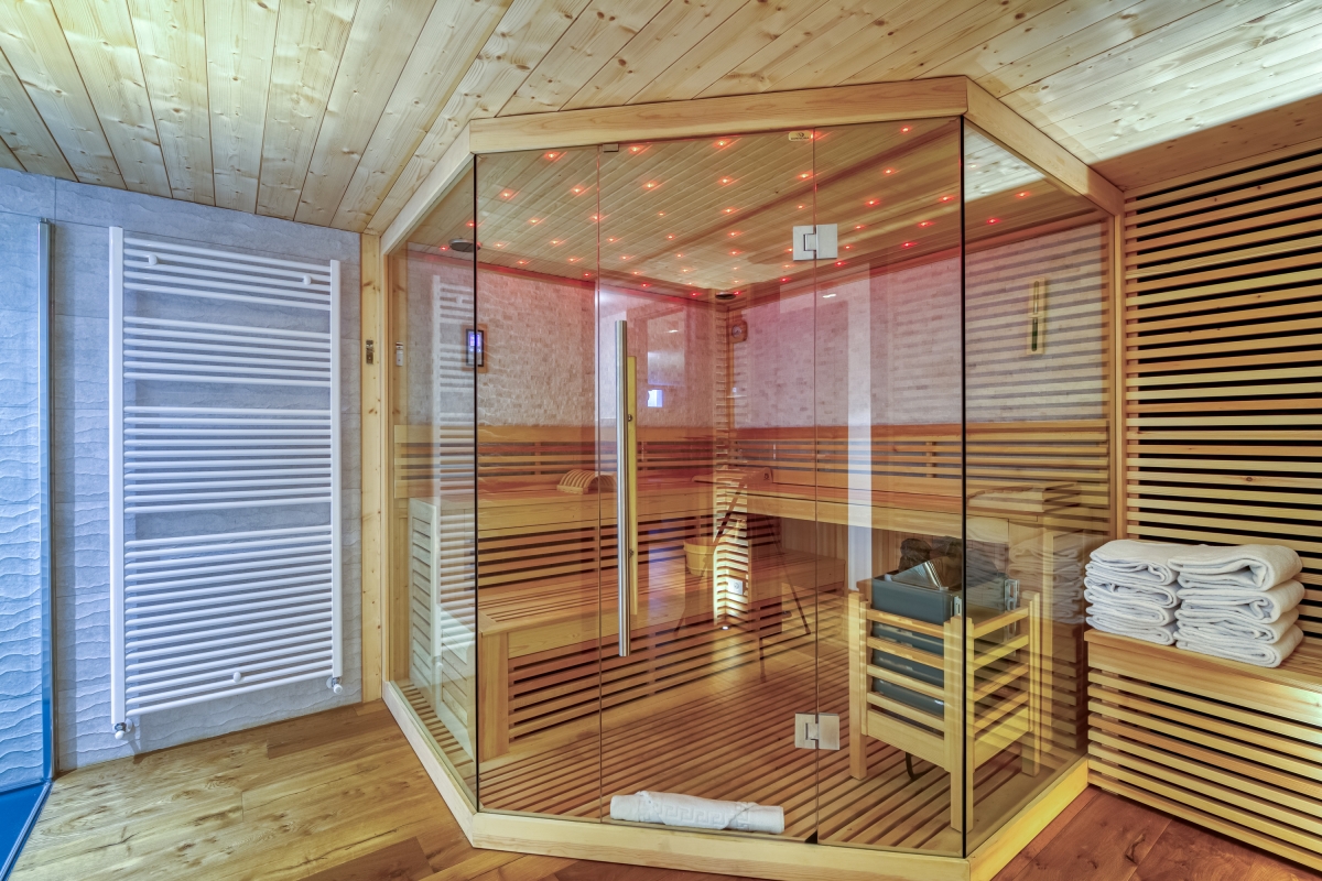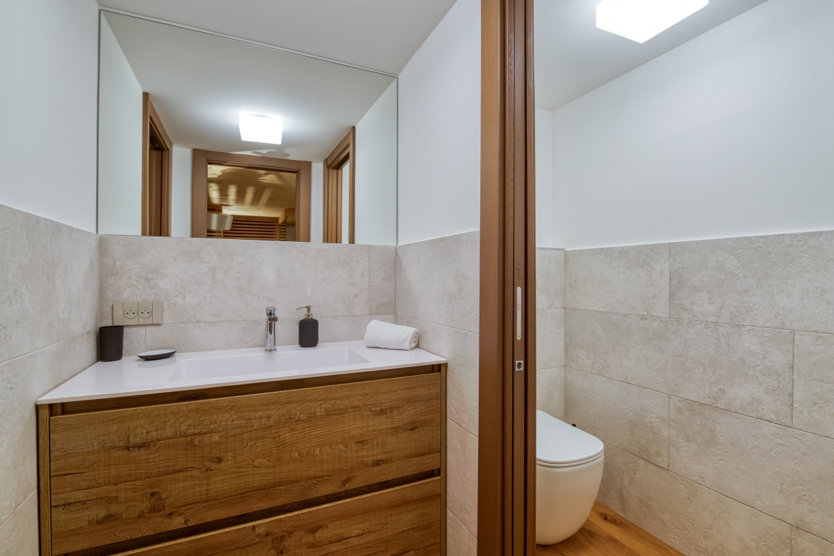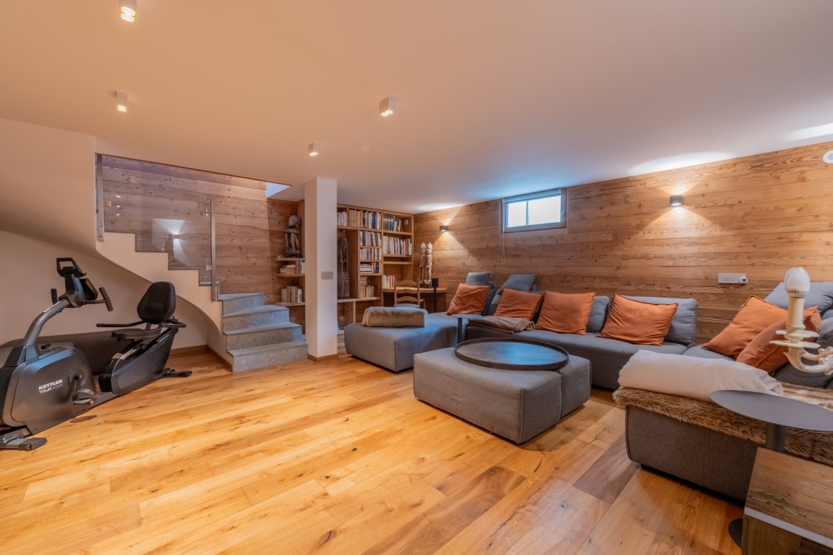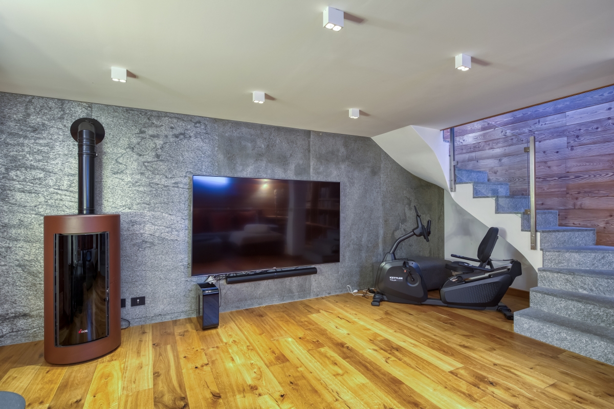 A spiral staircase leads to two bedrooms and a private cinema room, perfect for cosy movie nights. The lower-ground-floor lounge is a true relaxation space, offering comfortable sofas, a large screen, a modern wood-burning stove, a workspace suitable for laptops, a library, and even an exercise bike for active guests. For ultimate relaxation, a sauna is available in the basement.