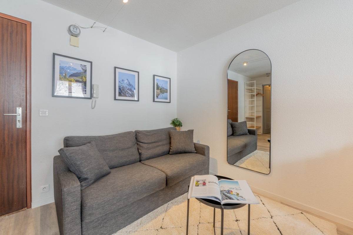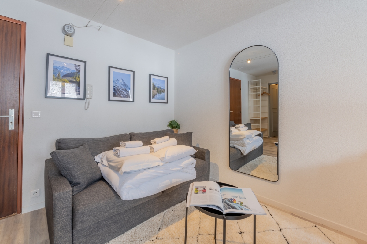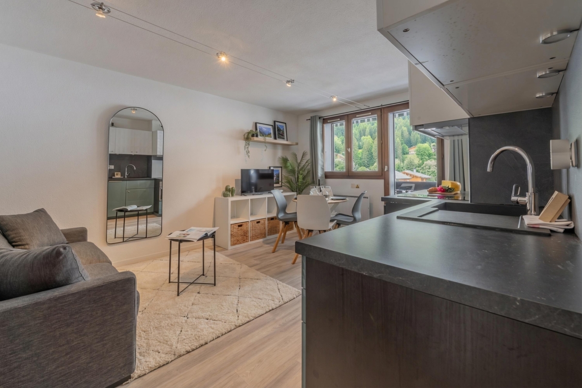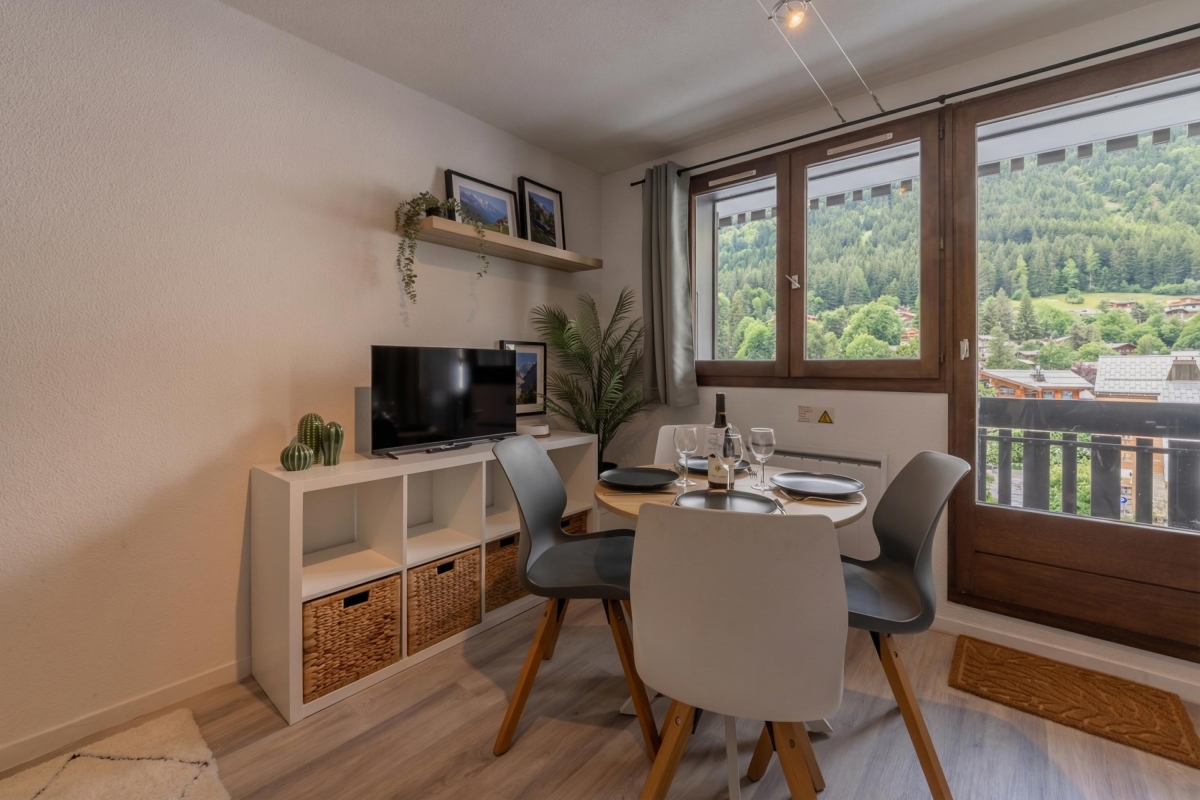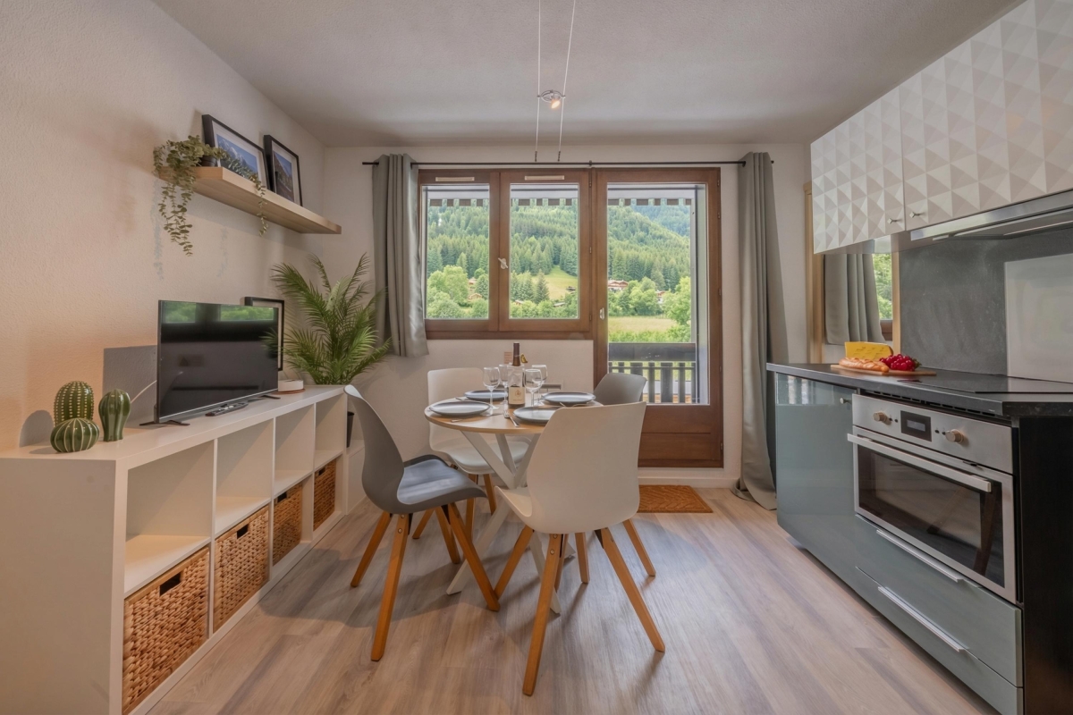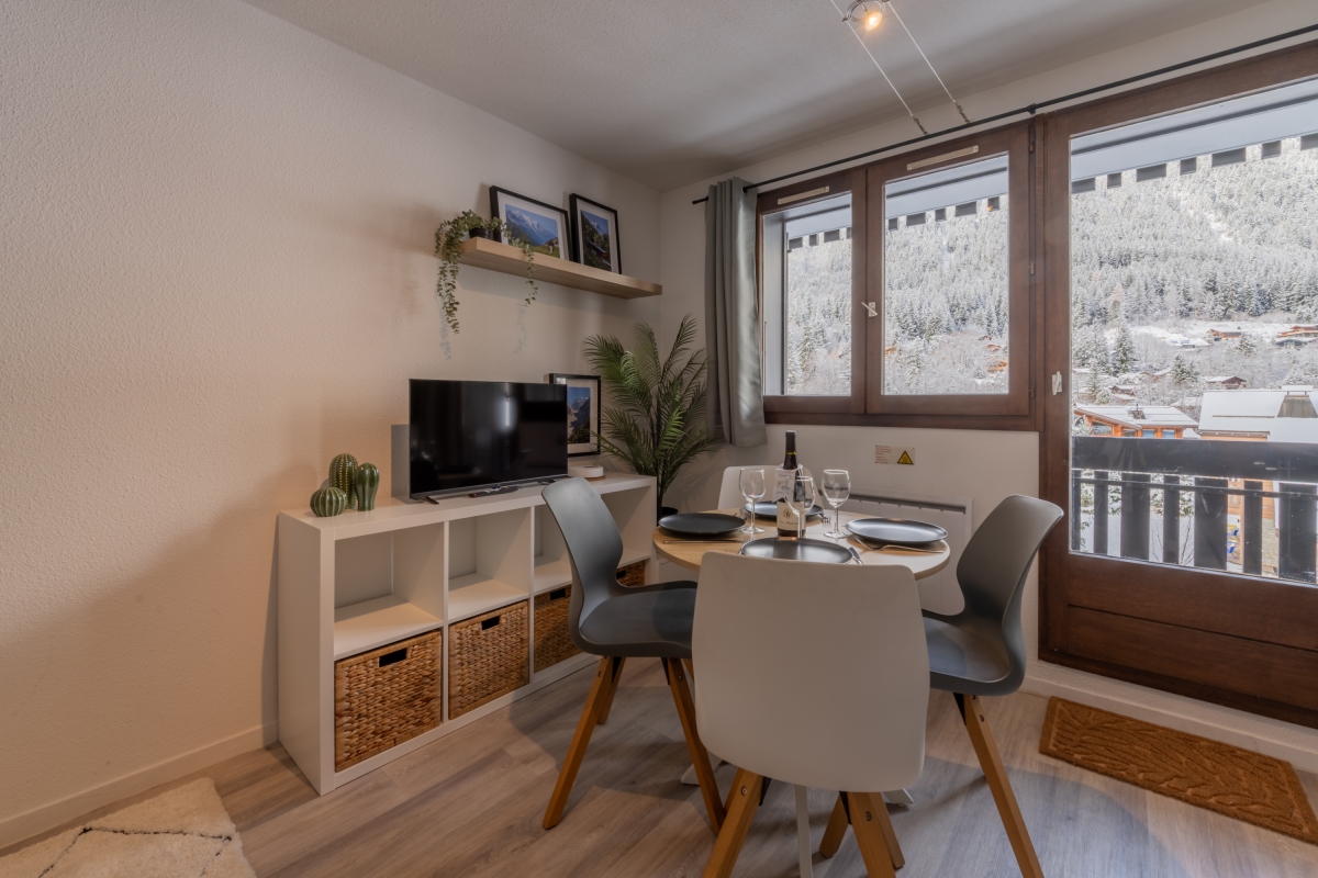 Located on the second floor with lift access, this thoughtfully decorated apartment features large windows and a private balcony, offering panoramic views of the Flegère and Brévent peaks. Inside, the bright open-plan living and dining area features a comfortable contemporary sofa (which converts into a double bed), a flat-screen TV and a dining table. The fully equipped kitchen — complete with induction hobs, oven, microwave, dishwasher, fridge-freezer and coffee machine — is perfect for relaxed meals at home after a day in the mountains.