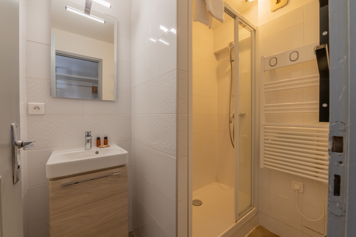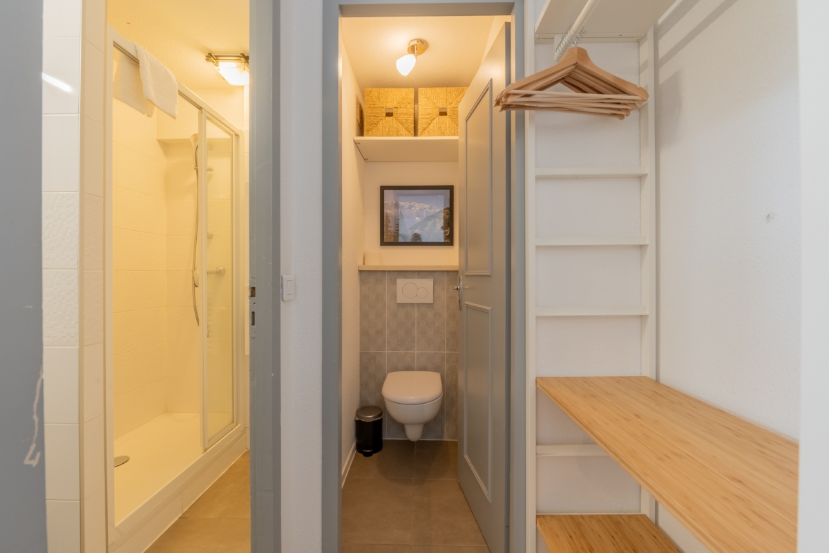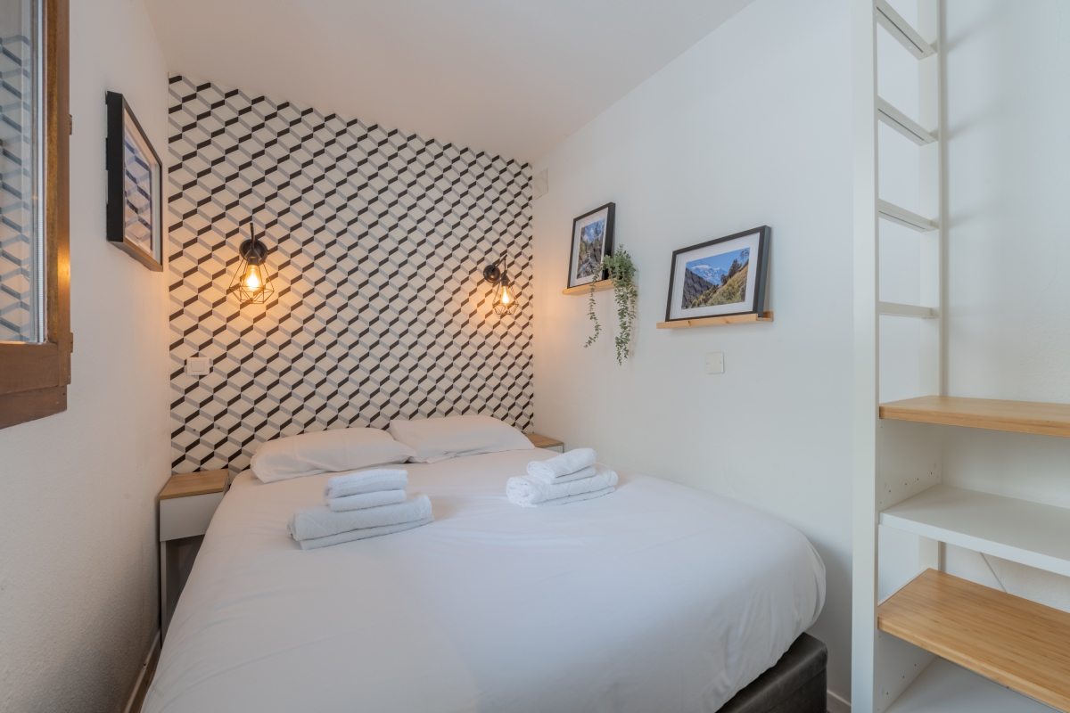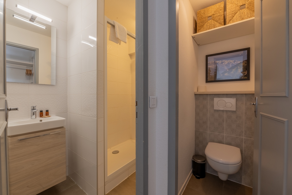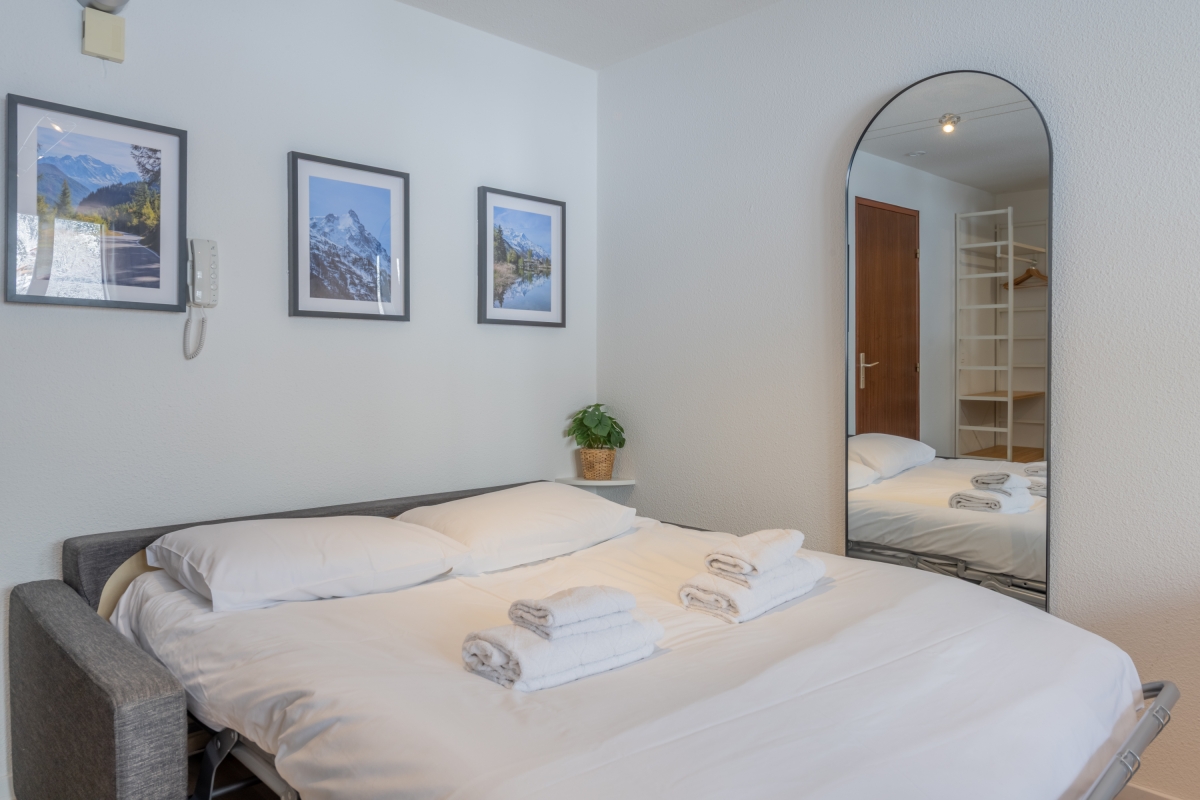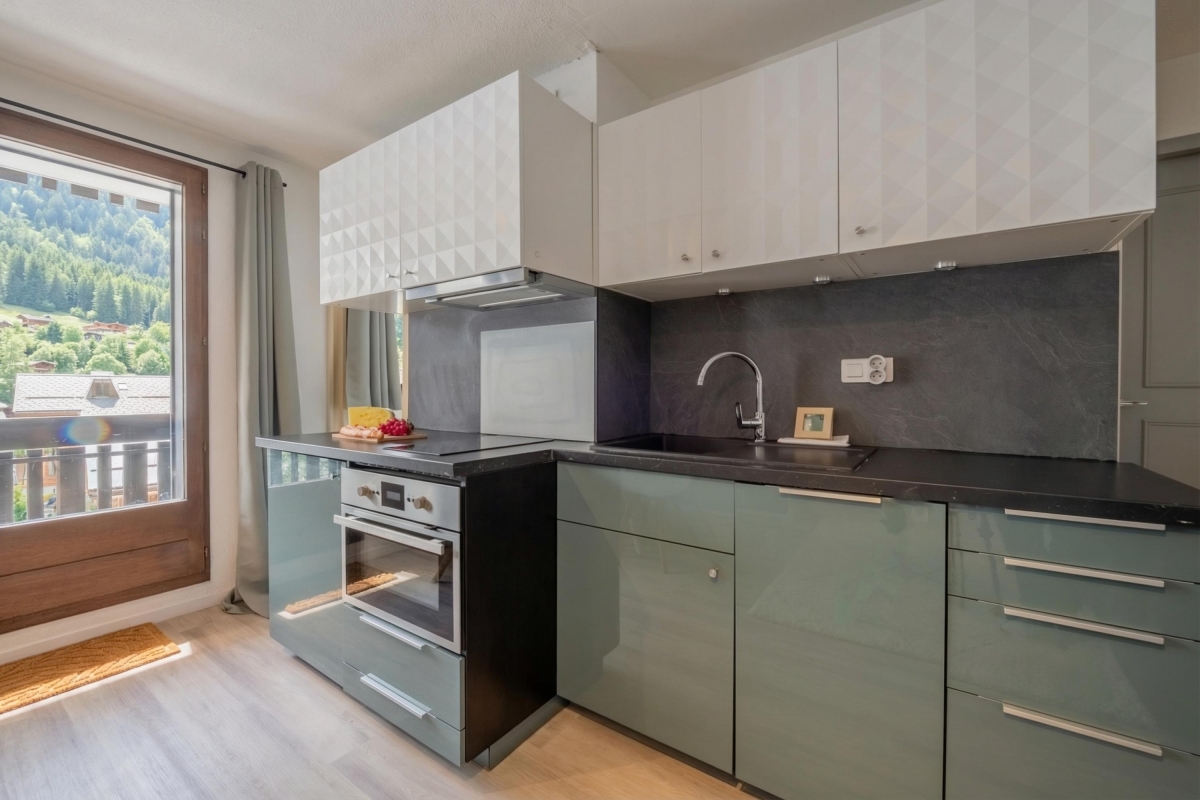 Located on the second floor with lift access, this thoughtfully decorated apartment features large windows and a private balcony, offering panoramic views of the Flegère and Brévent peaks. Inside, the bright open-plan living and dining area features a comfortable contemporary sofa (which converts into a double bed), a flat-screen TV and a dining table. The fully equipped kitchen — complete with induction hobs, oven, microwave, dishwasher, fridge-freezer and coffee machine — is perfect for relaxed meals at home after a day in the mountains.