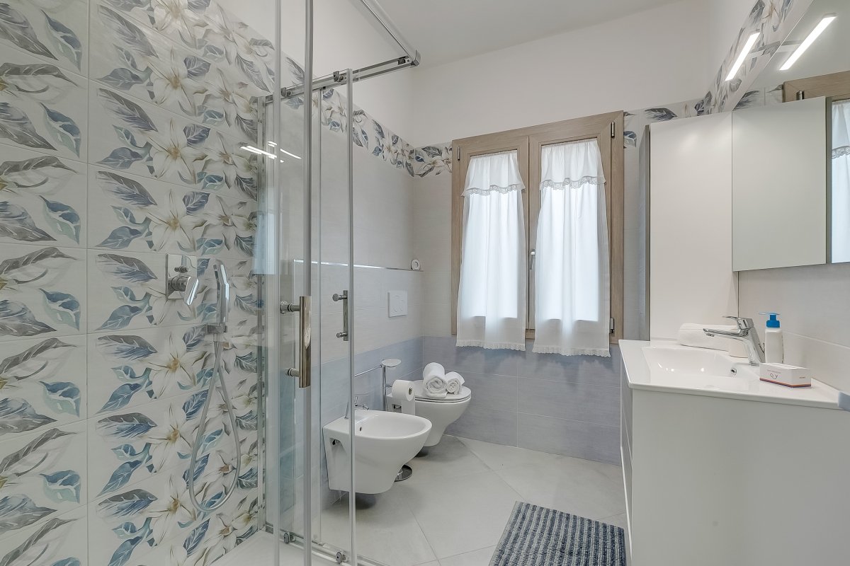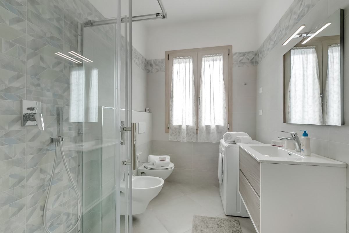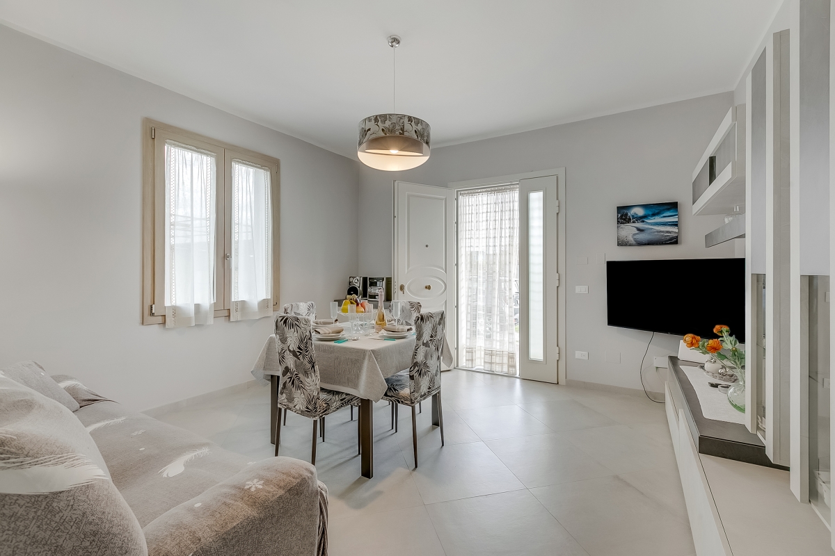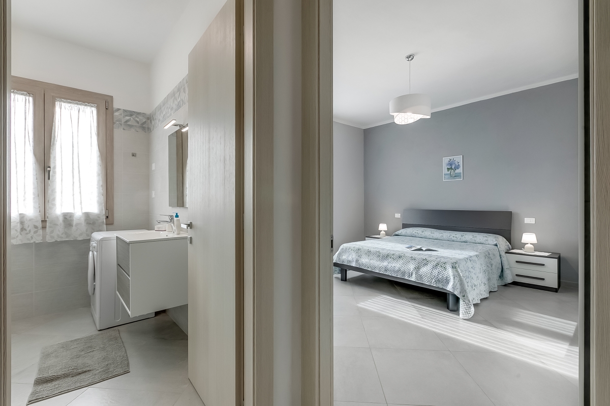 Arranged on the ground floor of a recently renovated two-storey house in Marina di Massa, the property features a spacious living area that’s furnished with a sofa and a Smart flatscreen TV. There’s also an elegant dining table with four chairs and a ceiling fan. The separate kitchen/dining room is equipped with a Moka coffee machine (for a true Italian coffee experience), a cooker hob, an oven, a microwave, a dishwasher, an American fridge freezer and a large dining table.
