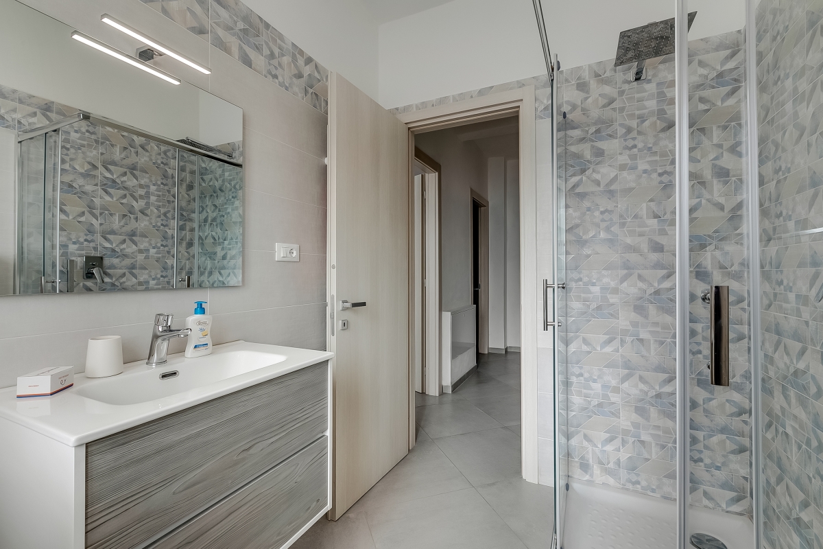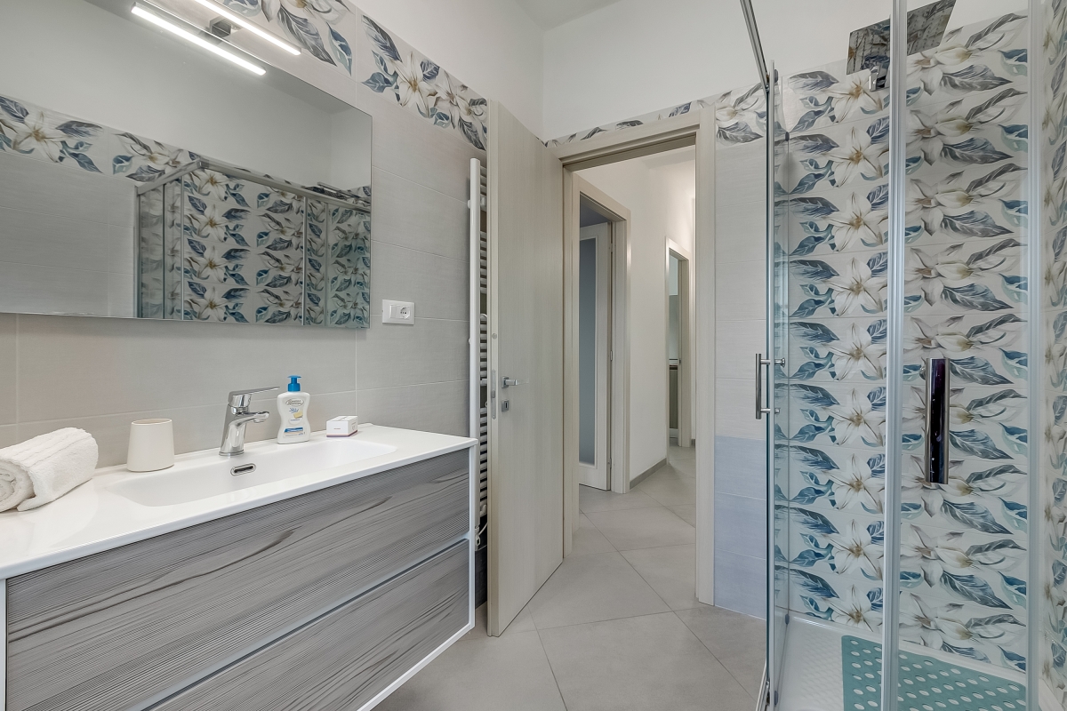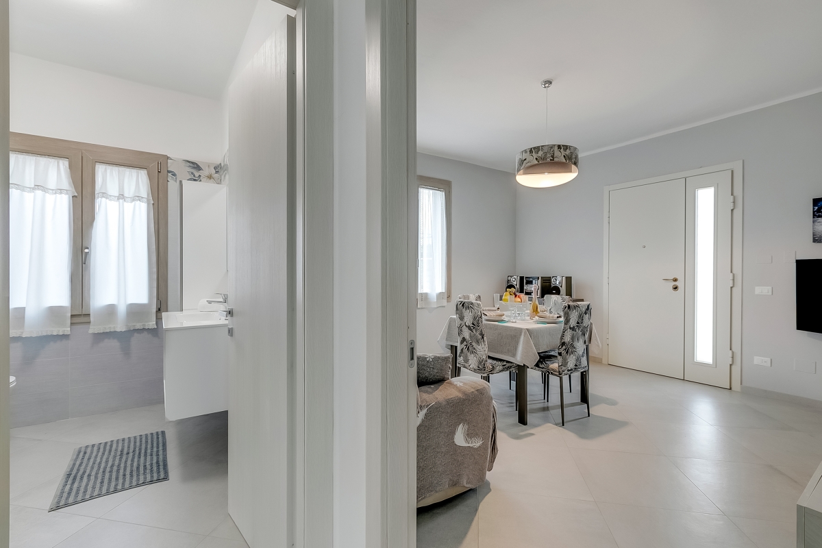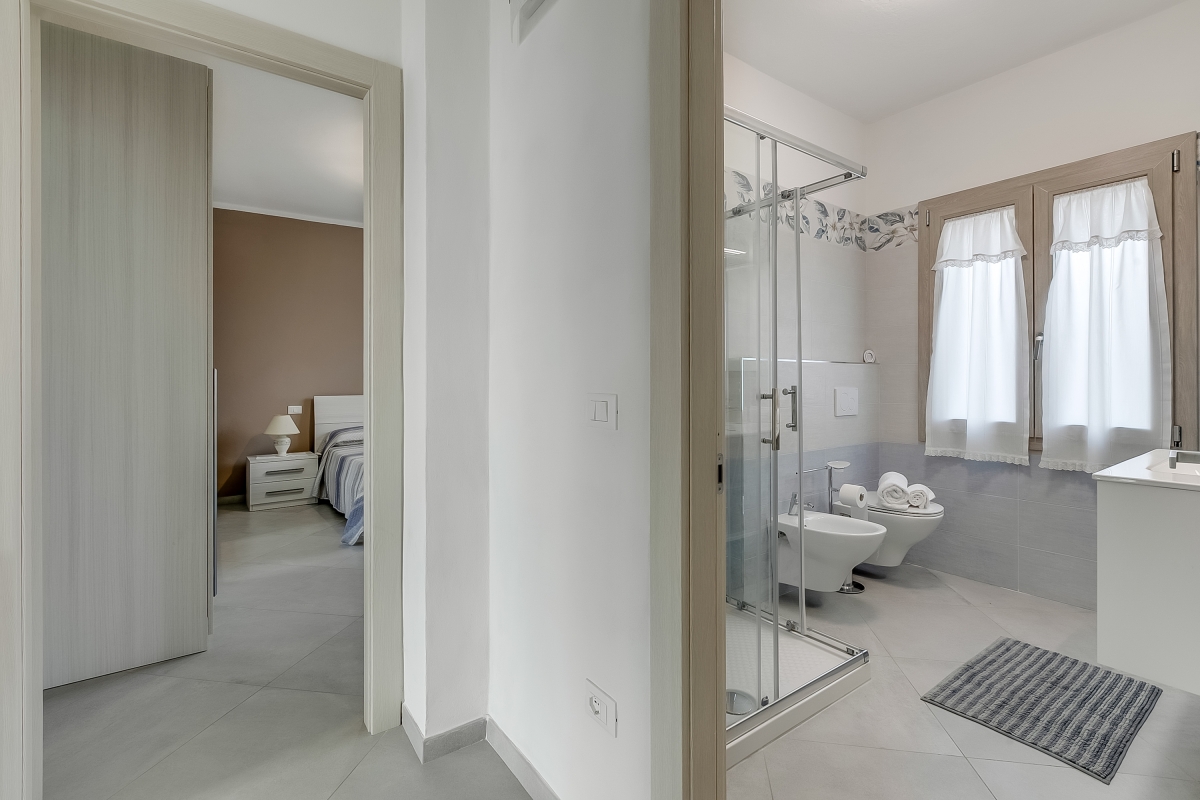 Arranged on the ground floor of a recently renovated two-storey house in Marina di Massa, the property features a spacious living area that’s furnished with a sofa and a Smart flatscreen TV. There’s also an elegant dining table with four chairs and a ceiling fan. The separate kitchen/dining room is equipped with a Moka coffee machine (for a true Italian coffee experience), a cooker hob, an oven, a microwave, a dishwasher, an American fridge freezer and a large dining table.