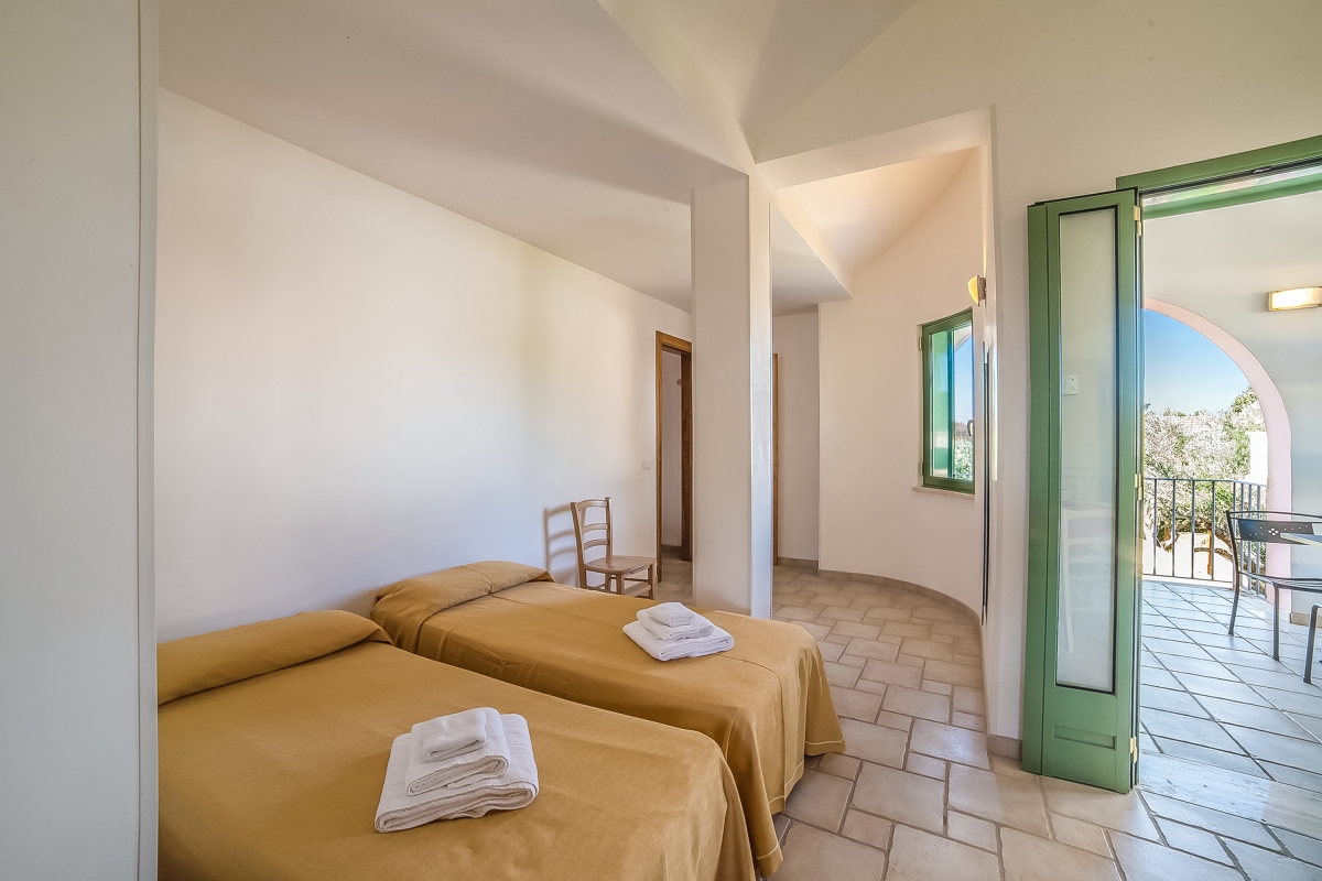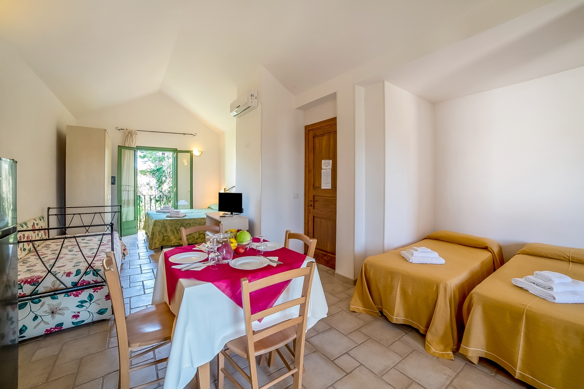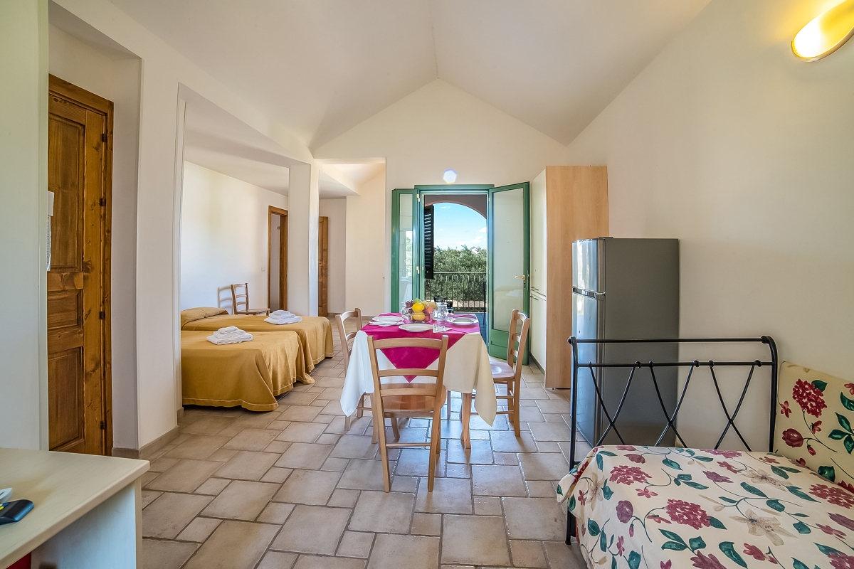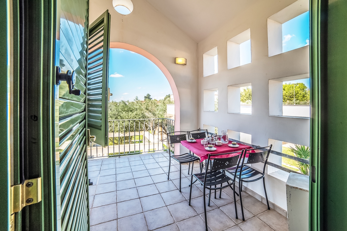 This first-floor apartment features a living room furnished with a double bed, three single beds, AC and a wardrobe. Outside, there is a shared outdoor swimming pool and a fenced garden area, perfect for family activities. An outdoor dining area with a table allows guests to enjoy meals in the sunny Italian climate.