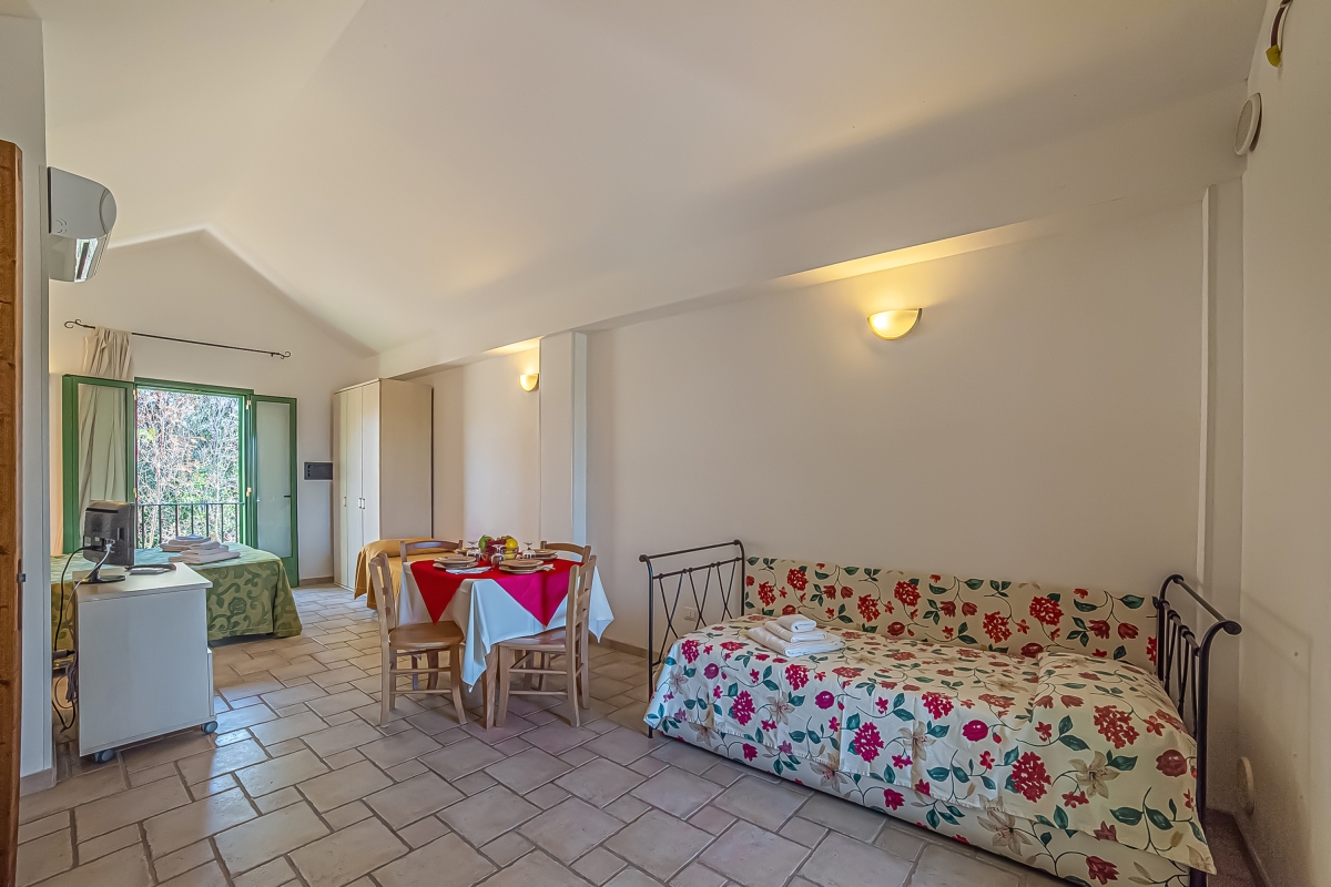 This air-conditioned apartment accommodates up to 4 guests, featuring a spacious living room and a well-appointed bathroom. The living room features a double bed, two single beds, and a dining area. The kitchenette is equipped with a coffee machine and a cooker hob.