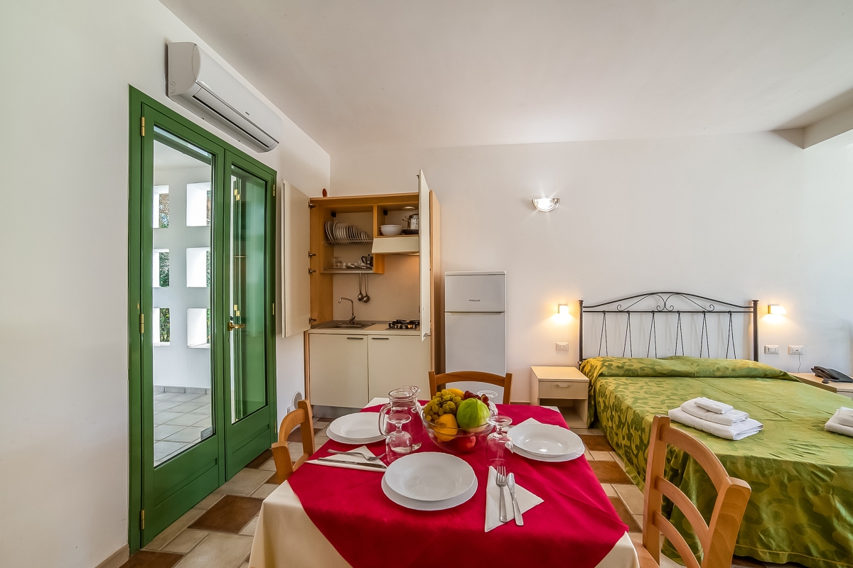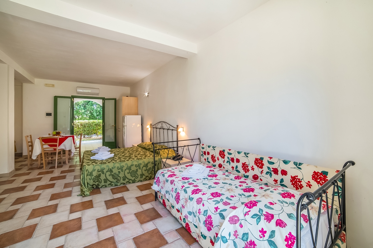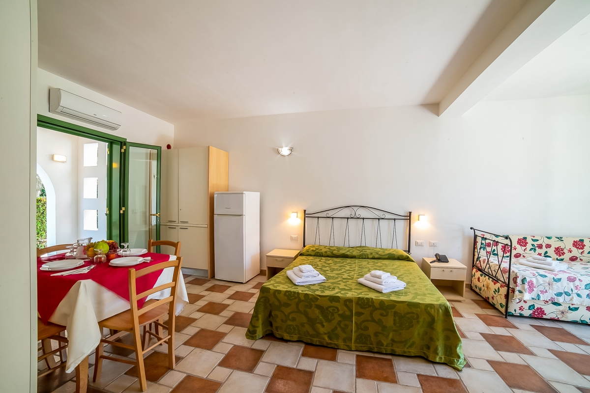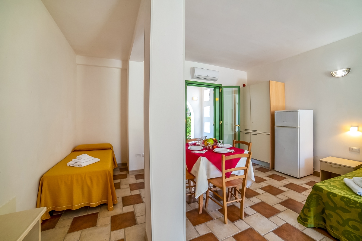 This air-conditioned apartment accommodates up to 4 guests and features a comfortable living room with a double bed, two single beds, and a dining table. The kitchenette features a coffee machine, a cooker hob and a fridge.