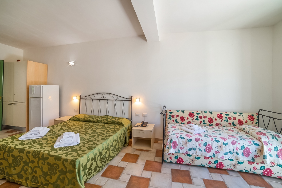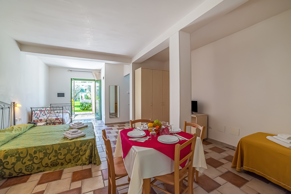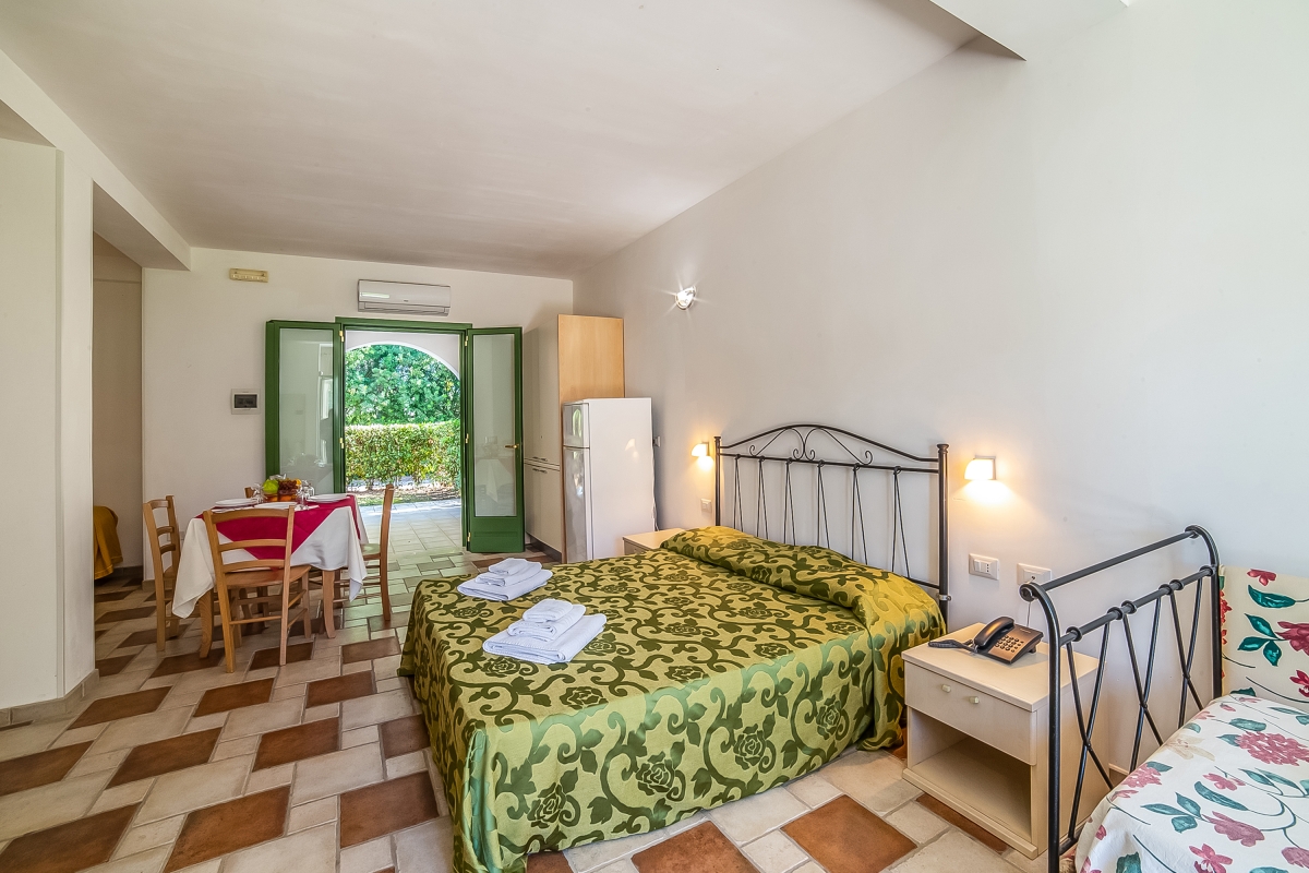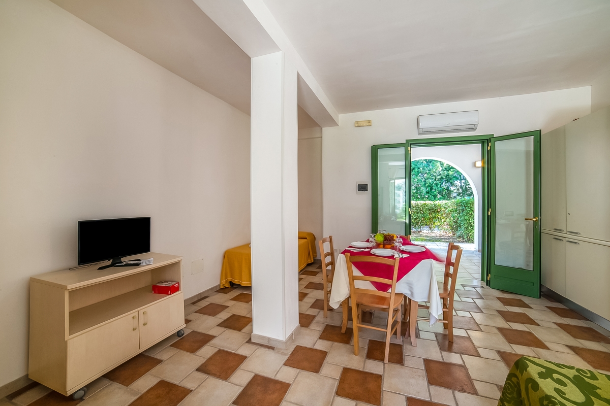 This air-conditioned apartment accommodates up to 4 guests and features a comfortable living room with a double bed, two single beds, and a dining table. The kitchenette features a coffee machine, a cooker hob and a fridge.