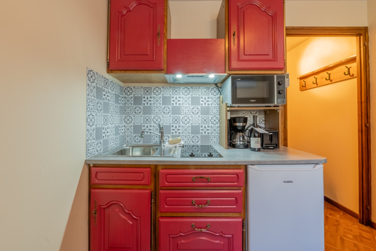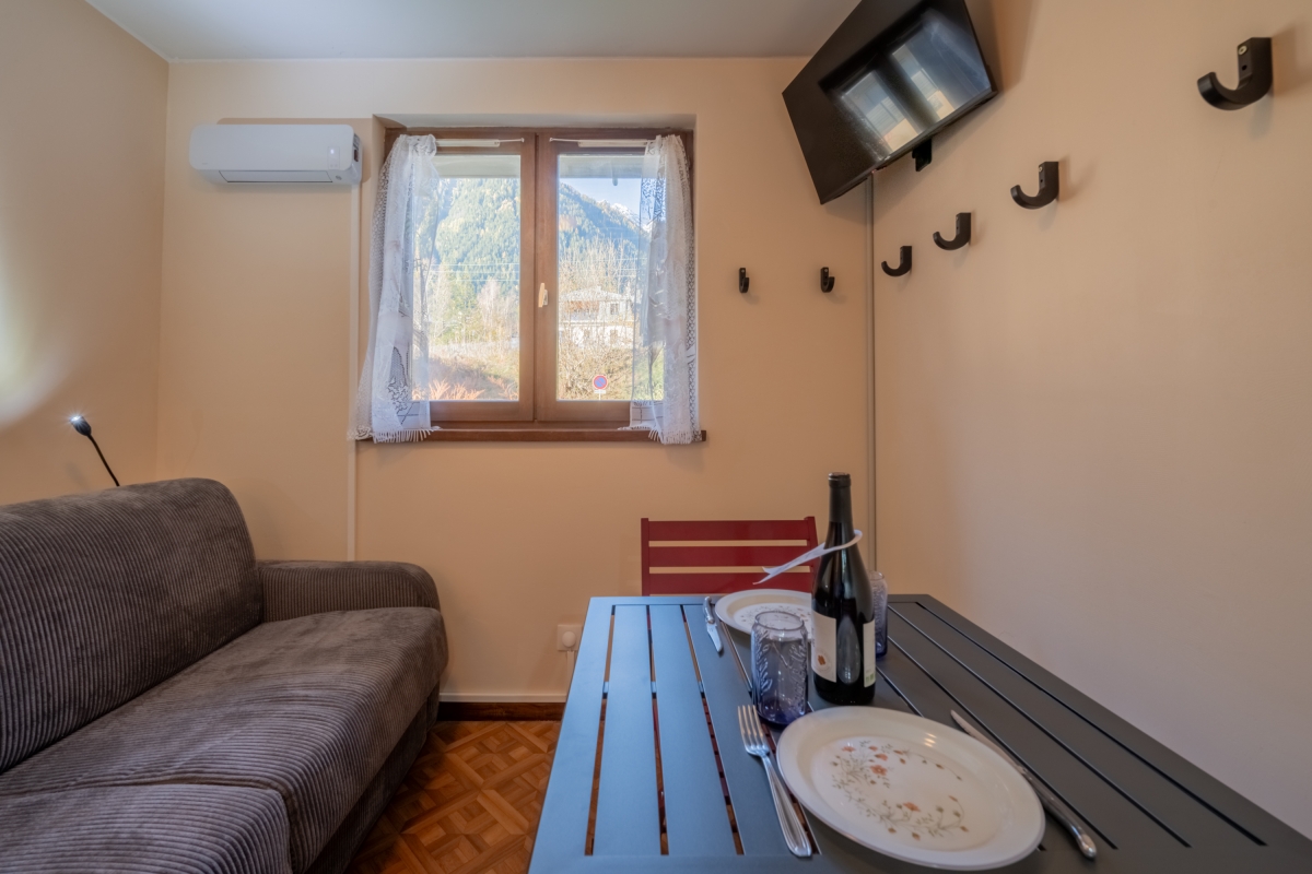 The front door opens onto a hallway which leads to the open-plan living area. This is furnished with a sofa, flat-screen Smart TV and a dining table for two, next to the fitted kitchenette. The kitchenette is equipped with an induction hob, oven, microwave, drip coffee machine, kettle, fridge and toaster.