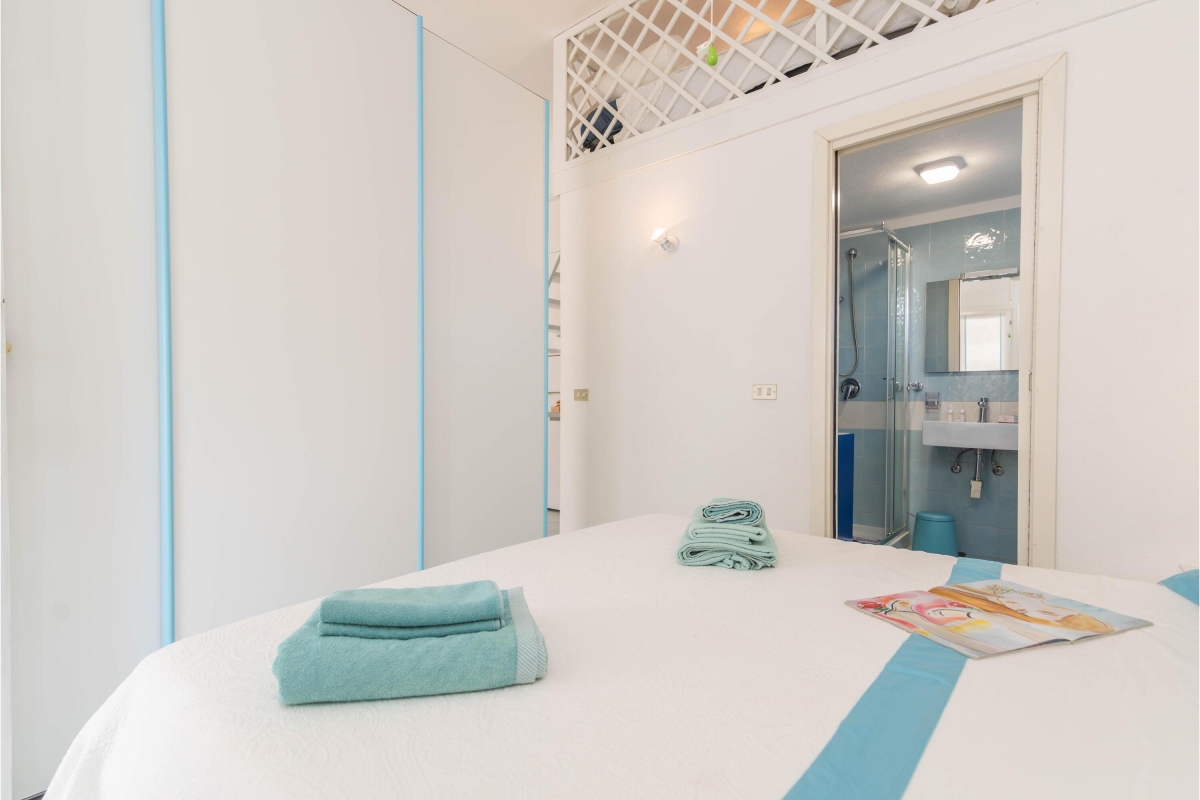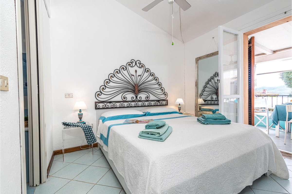 Bedroom 1: The bedroom enjoys access to the terrace and is furnished with a comfortable double bed and a wardrobe