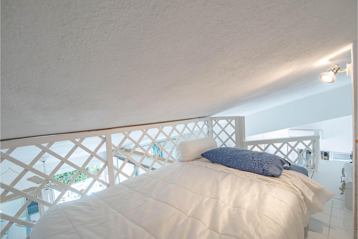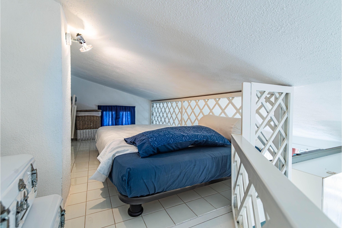 Extra: There is a single bed positioned on a small mezzanine above the main living space.