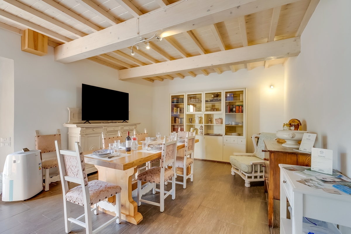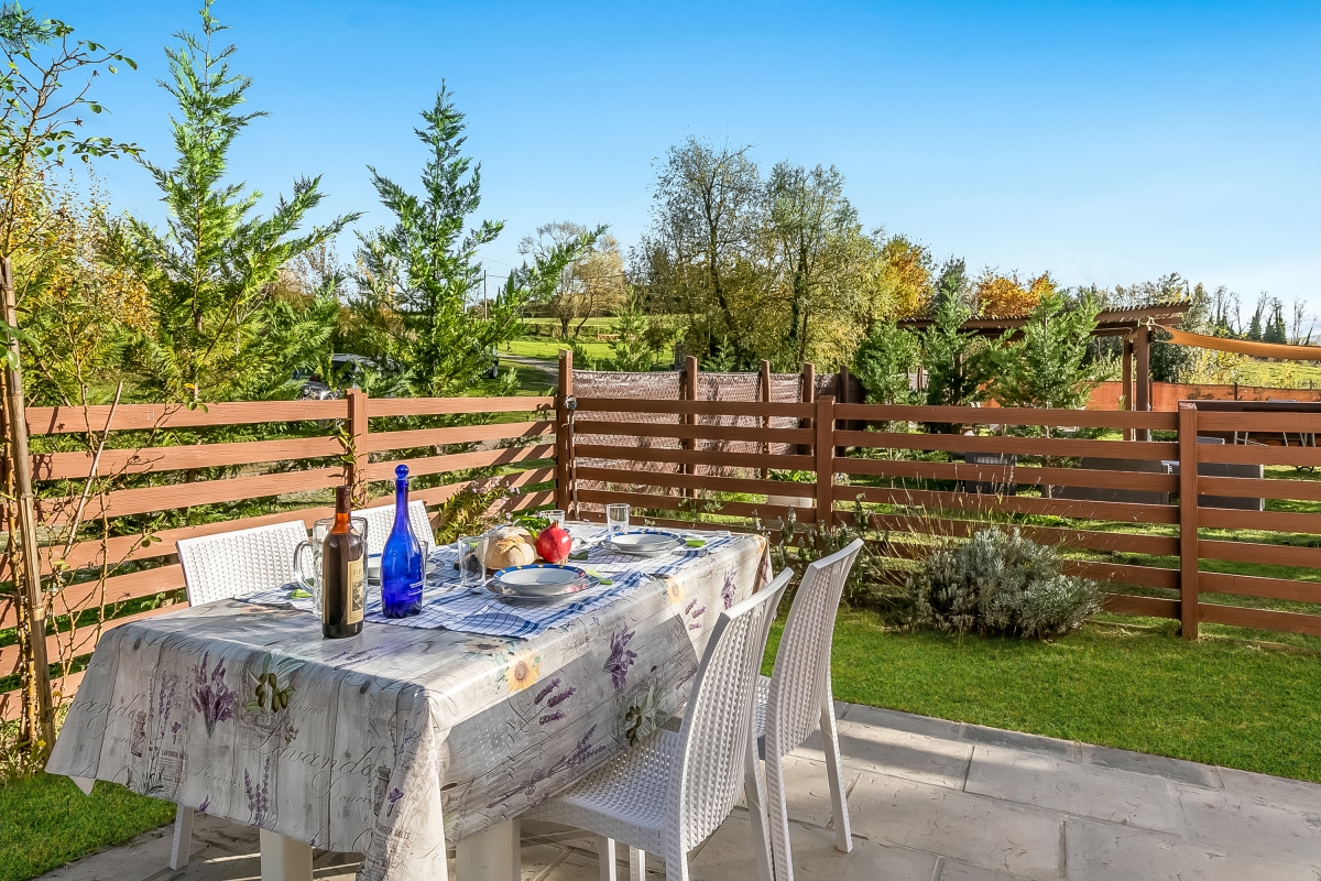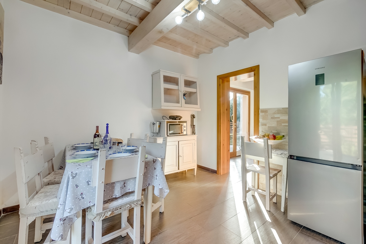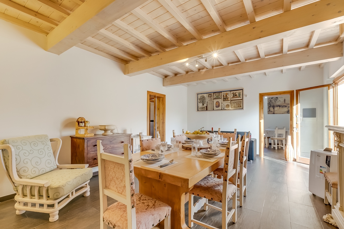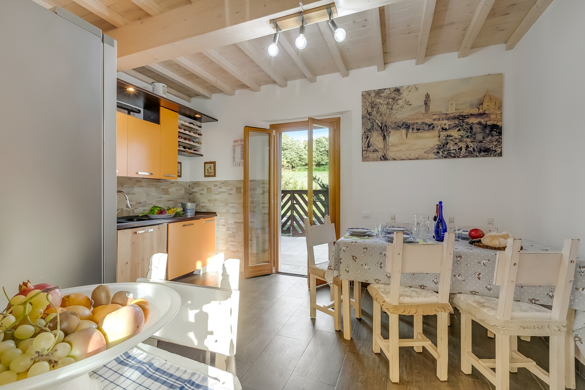 The apartment, which sleeps 6, is on the ground floor with a private garden. The spacious living/dining room has a contemporary sofa, a flat-screen TV and a dining table. Glass doors lead onto the garden. The modern kitchen is next to the sitting room. It is well-equipped with an induction hob, oven, dishwasher, fridge, freezer and Moka coffee maker, plus a table and chairs for quick snacks. French windows lead from the kitchen to one of the two outdoor dining areas.