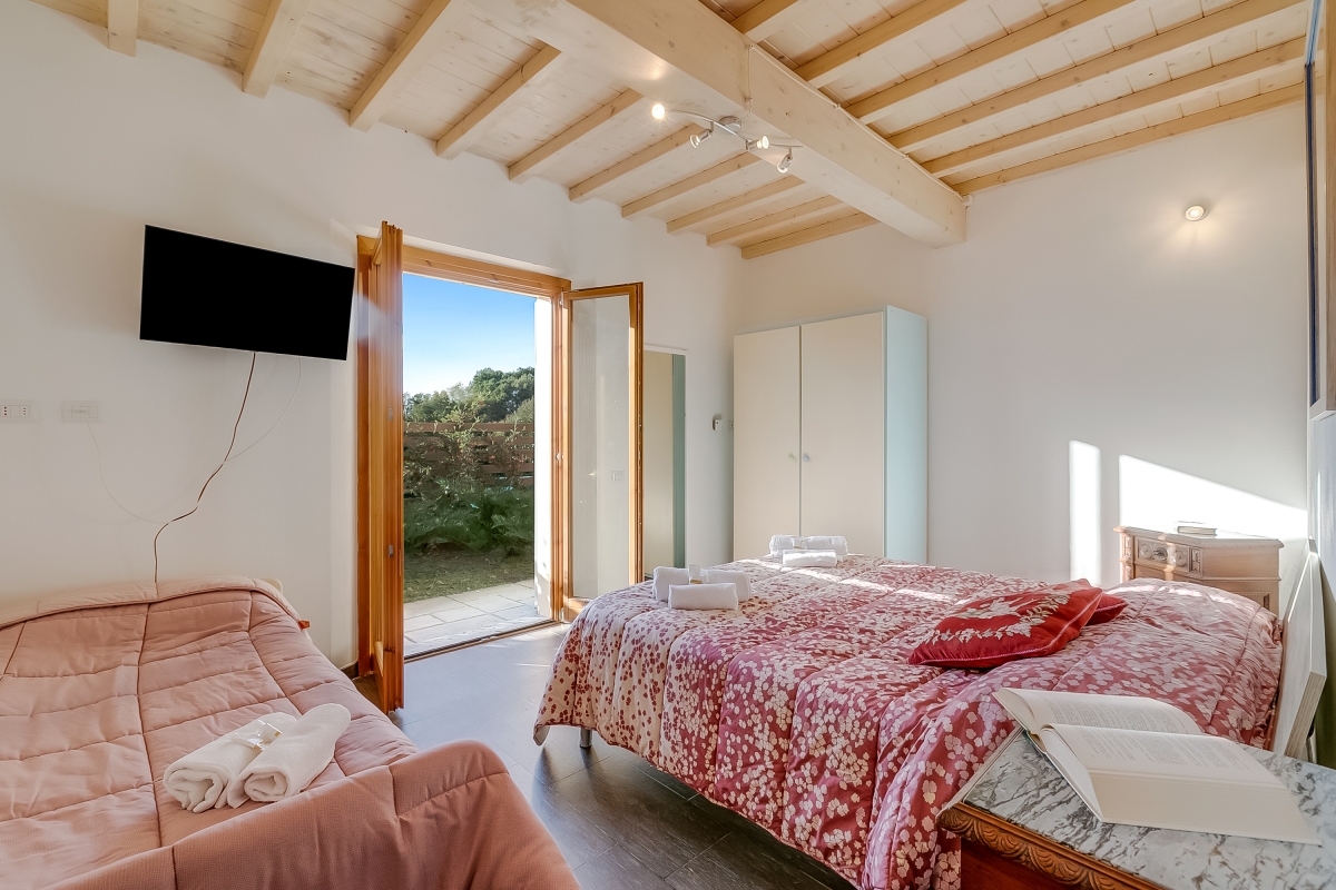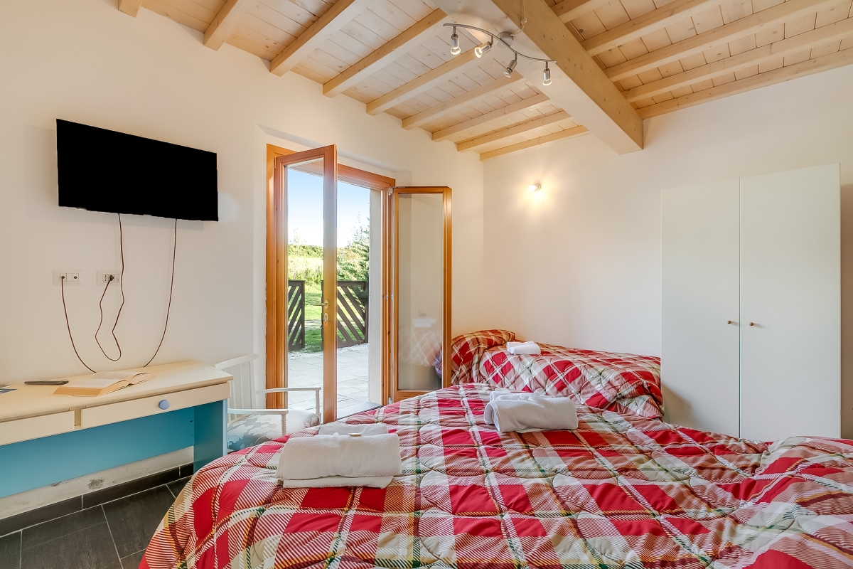 Bedroom 1: An airy bedroom furnished with a double bed, a single bed, flat-screen TV and a wardrobe. Glass doors give direct access to the garden