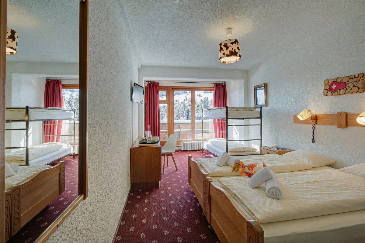This room features 2 single beds, a bunk bed, a wardrobe, a bathroom and opens onto a balcony. Equipped with free Wi-Fi, the room offers a comfortable space to unwind after a day in the mountains.