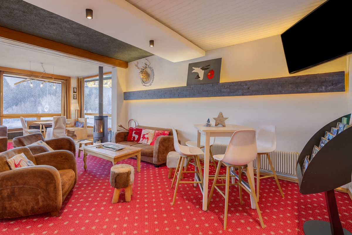 Below the reception level (-1), the hotel provides a meeting room, a kids’ room (under parental supervision), ski-shoe racks for all guests, and access to toilets.