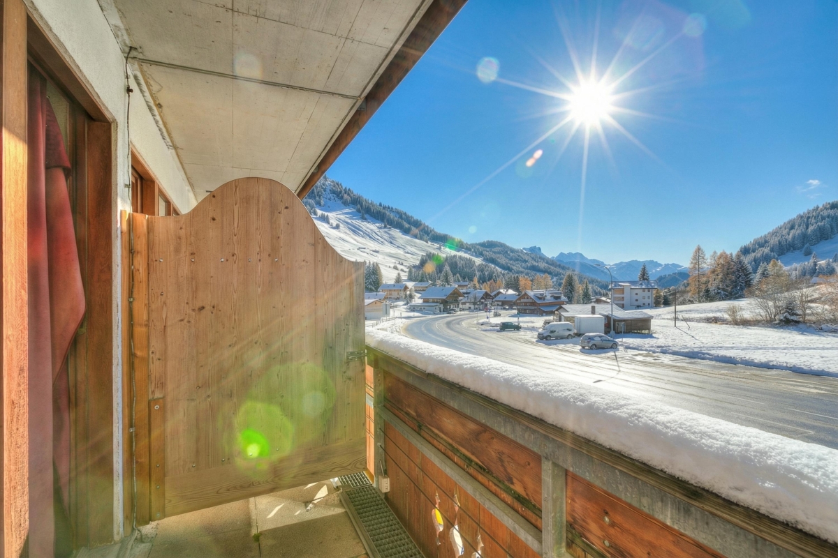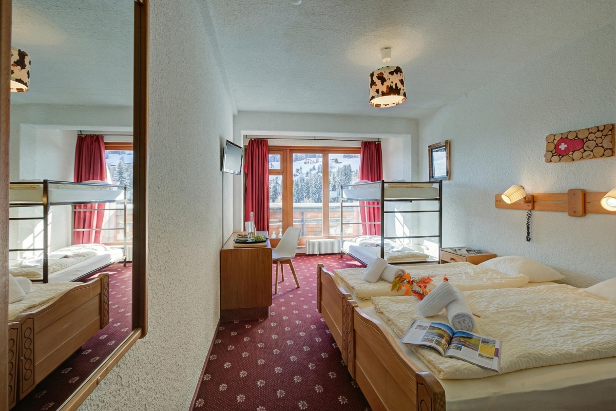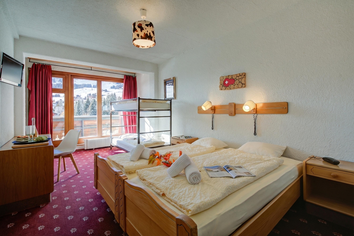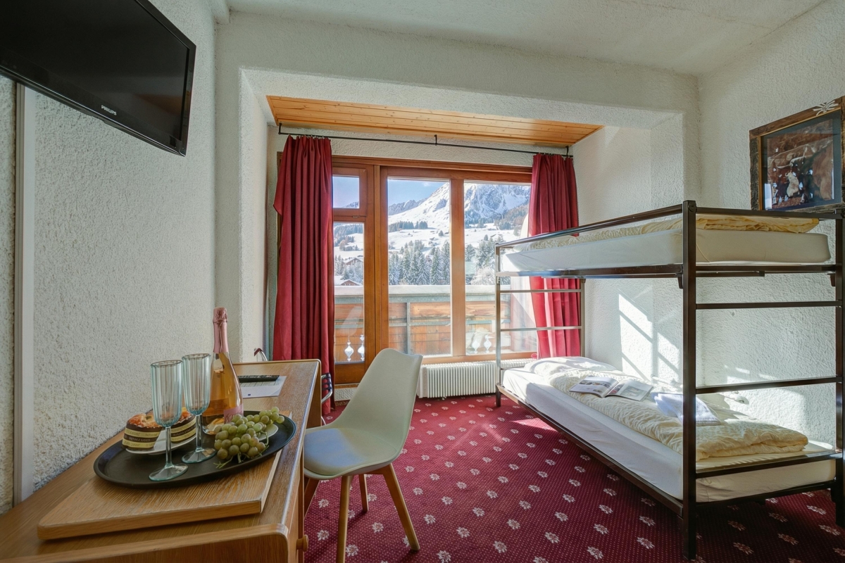 Enjoy a serene alpine retreat in the picturesque town of Les Mosses, accommodating up to 4 guests. The room features two single beds, a bunk bed and a private balcony with sweeping mountain views.