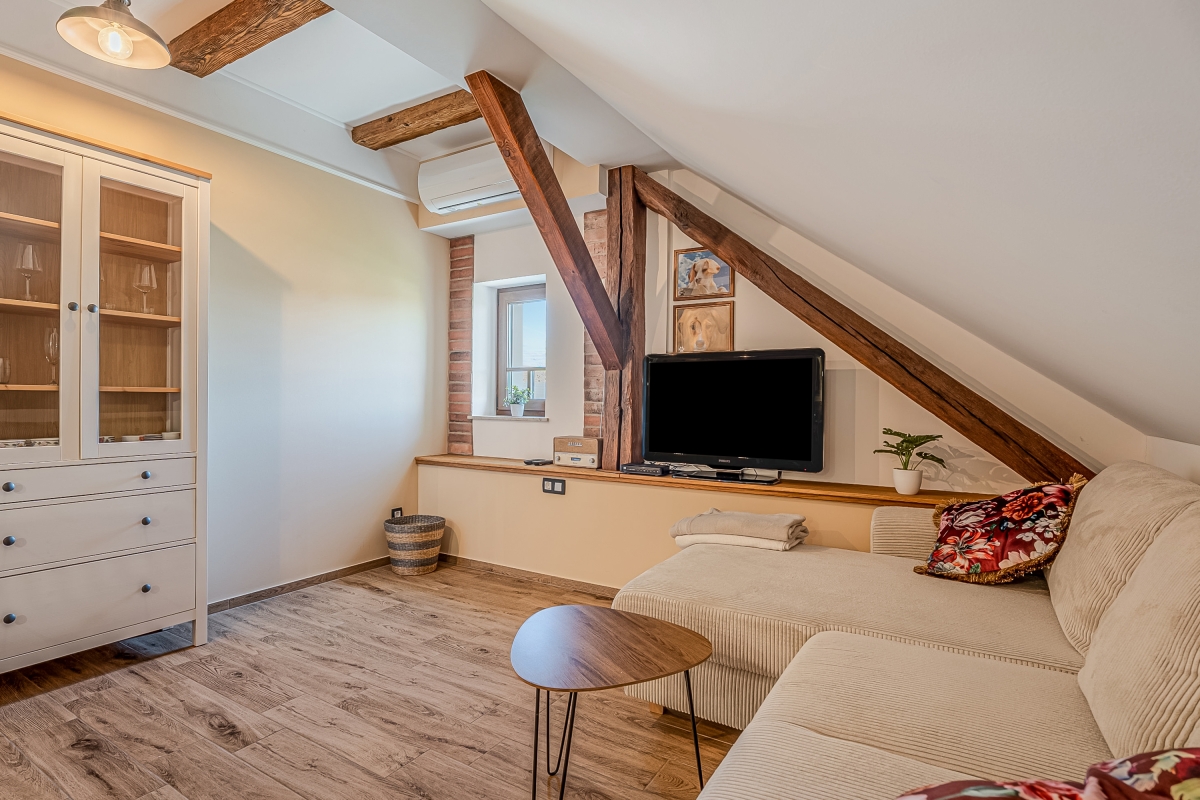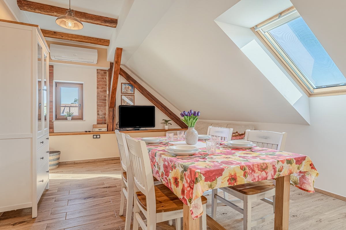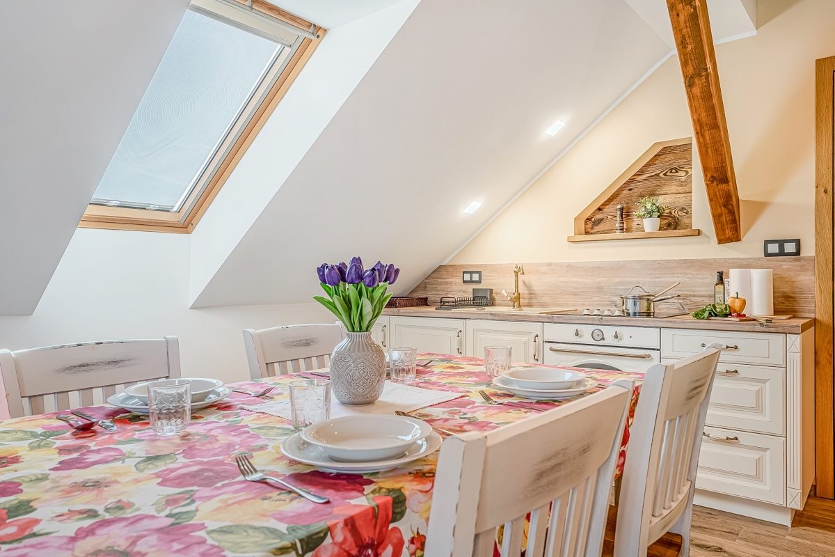 The first-floor apartment is tucked under the eaves, but is light and airy thanks to several skylights. The open-plan living area is furnished with a comfortable corner sofa, a flatscreen TV, and a dining table next to the fitted kitchen. The kitchen is equipped with a cooker hob, oven, coffee machine, fridge/freezer and a kettle.