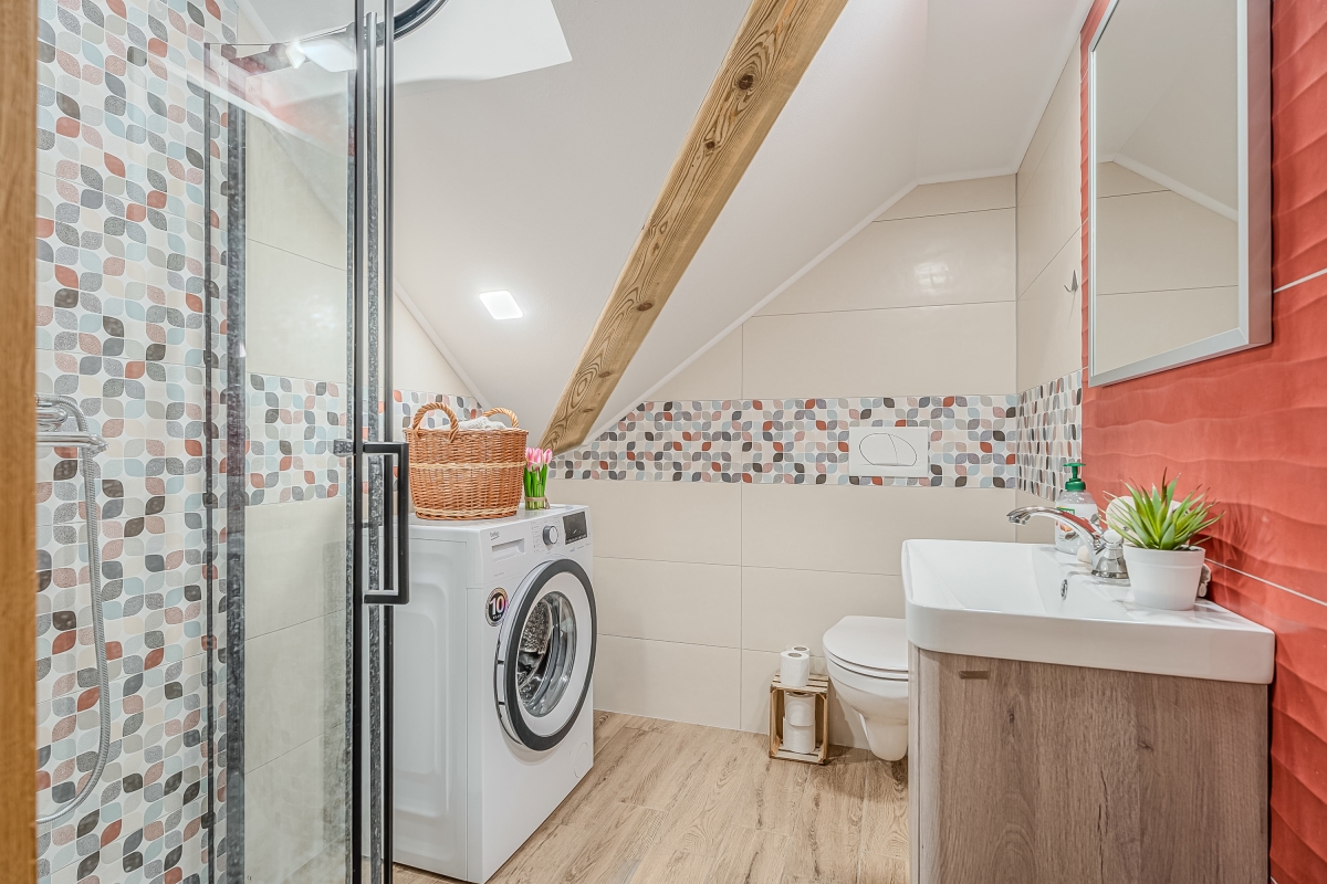 The tiled bathroom includes a glass shower, basin, washing machine and WC.