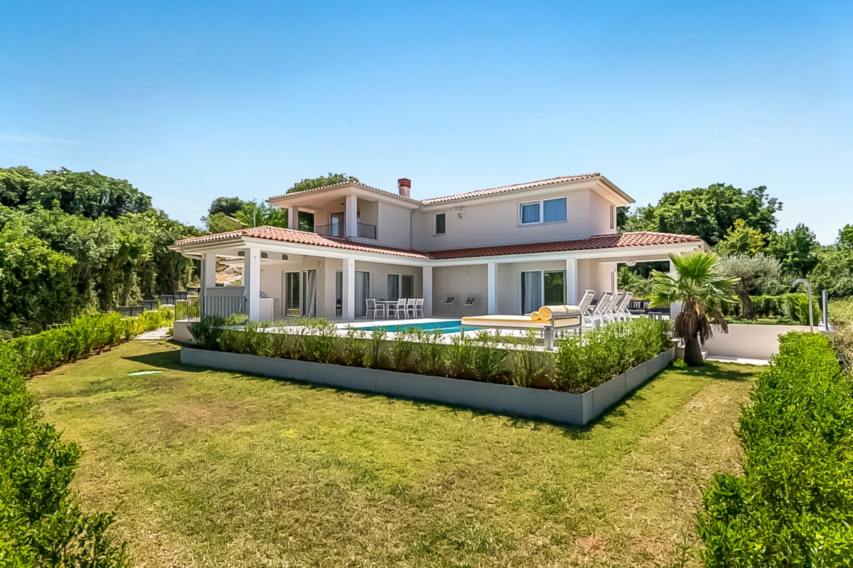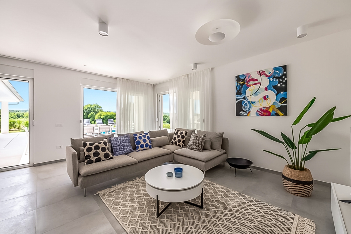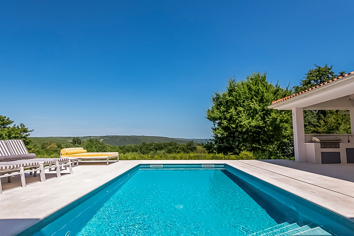 Unwind in a luxurious Istrian villa with private pool, olive grove views, elegant interiors, outdoor dining, and complete Mediterranean serenity.