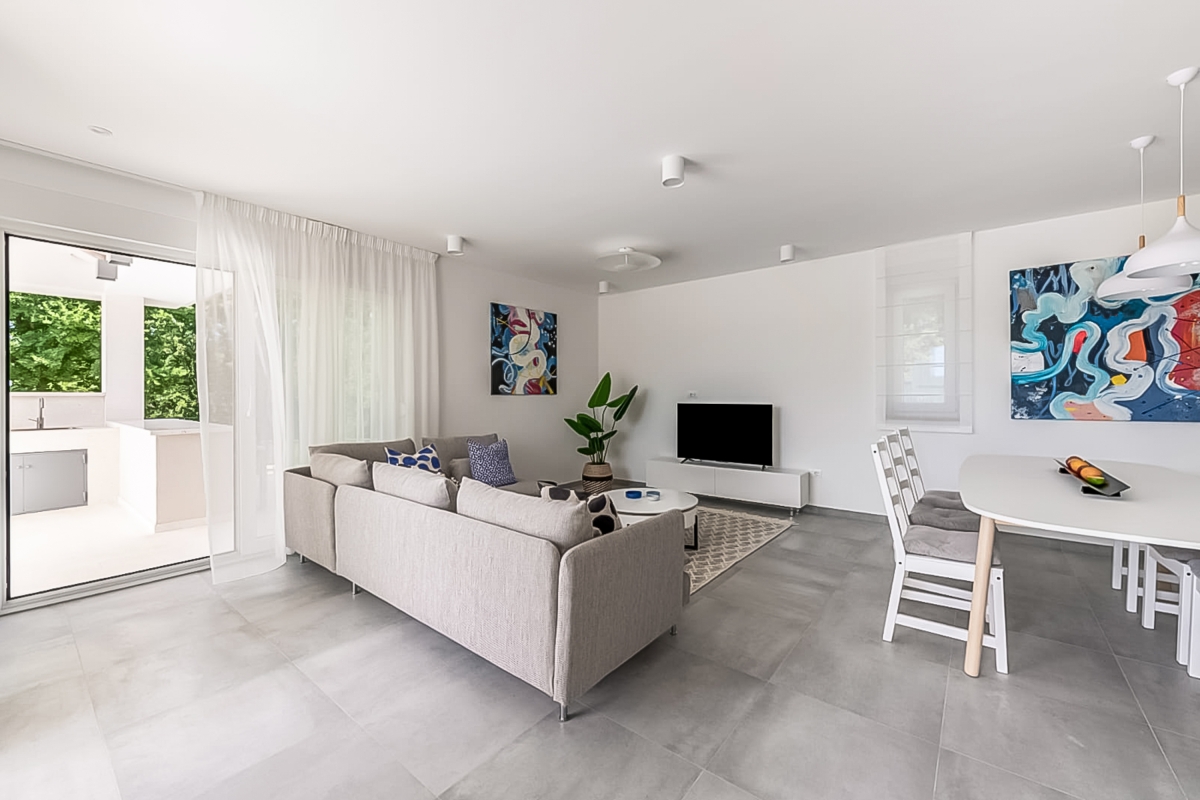 The true highlight of Villa Ora is its stunning outdoor space. A large private swimming pool invites you to cool off while enjoying serene views over the surrounding olive tree farms. A shaded terrace with an outdoor dining area and barbecue creates the perfect setting for relaxed meals and memorable evenings, all framed by a beautifully landscaped garden filled with Mediterranean plants and ancient olive trees. Villa Ora perfectly combines luxury, nature, and tranquility for an unforgettable Istrian escape.