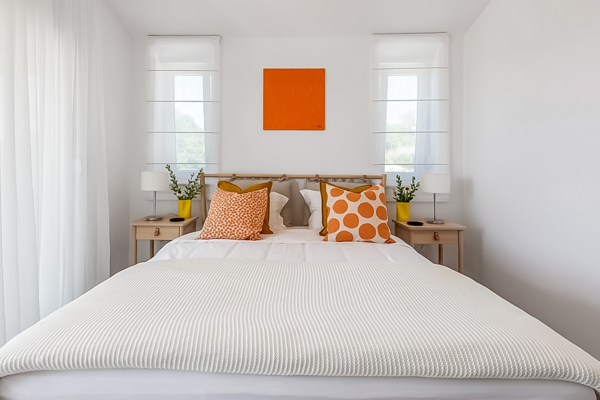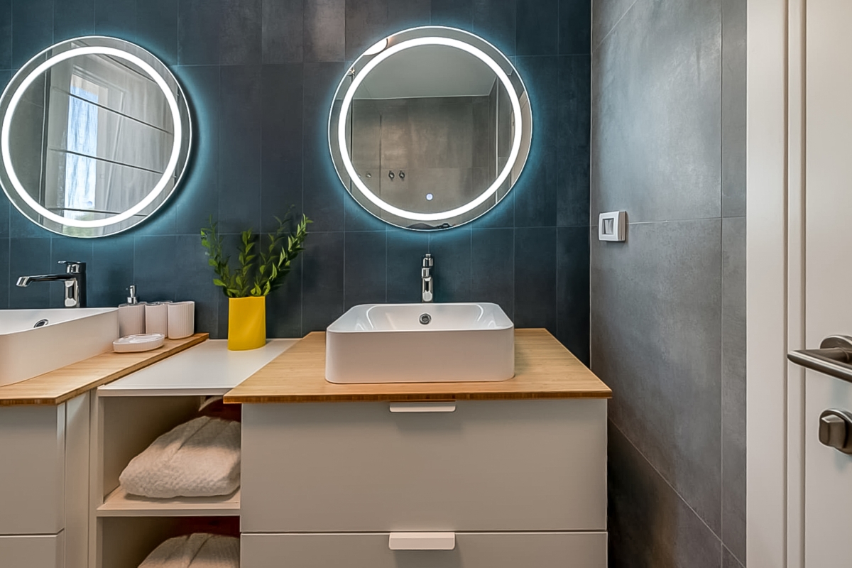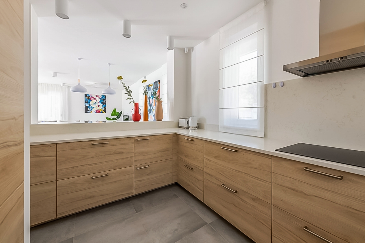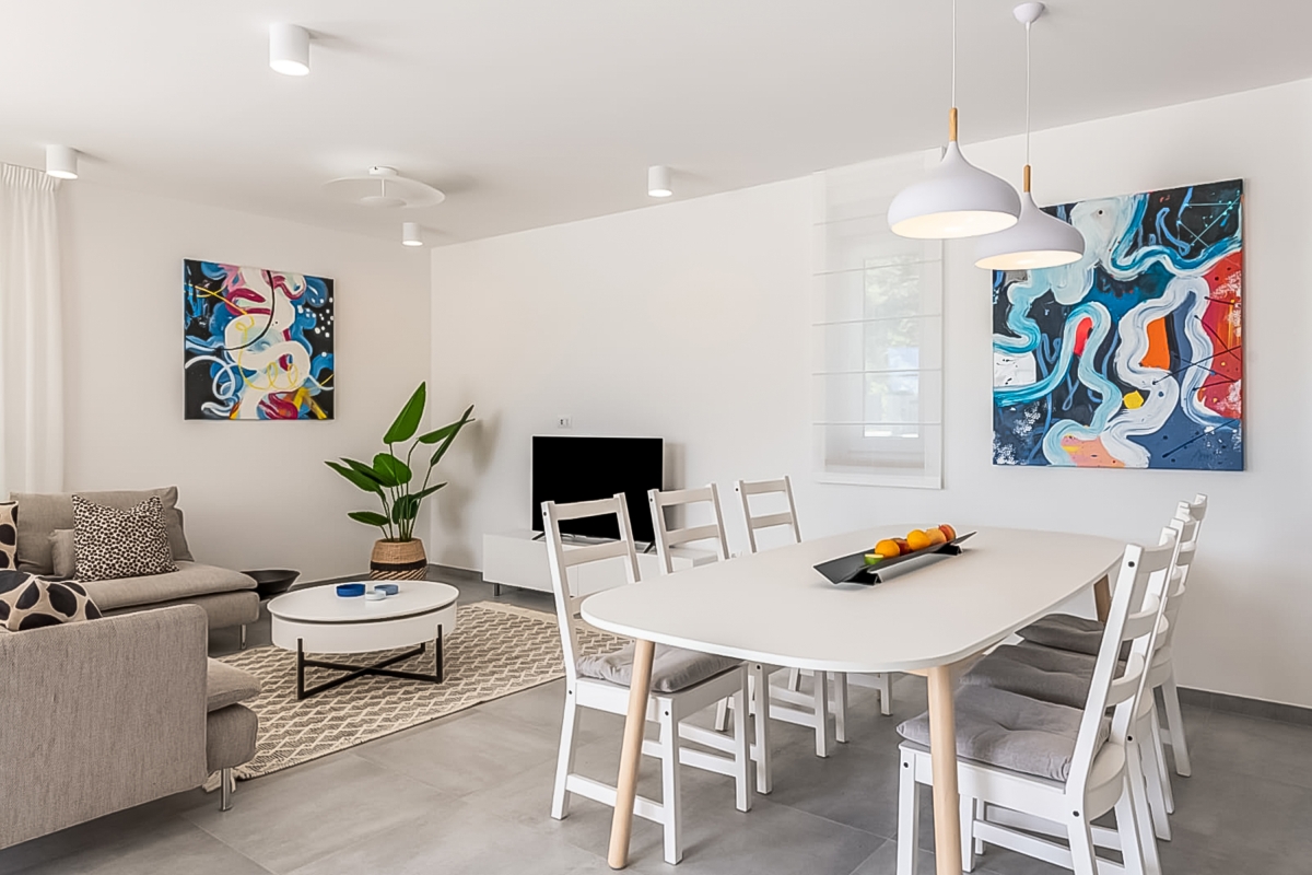 Set on the first floor, the villa features three tastefully decorated bedrooms, each with its own private bathroom, ensuring privacy and convenience for every guest. The spacious living room is bright and welcoming, seamlessly connected to a fully equipped kitchen fitted with an induction hob, oven, microwave, dishwasher, toaster, electric kettle, coffee machine, and a fridge with freezer—perfect for effortless self-catering.