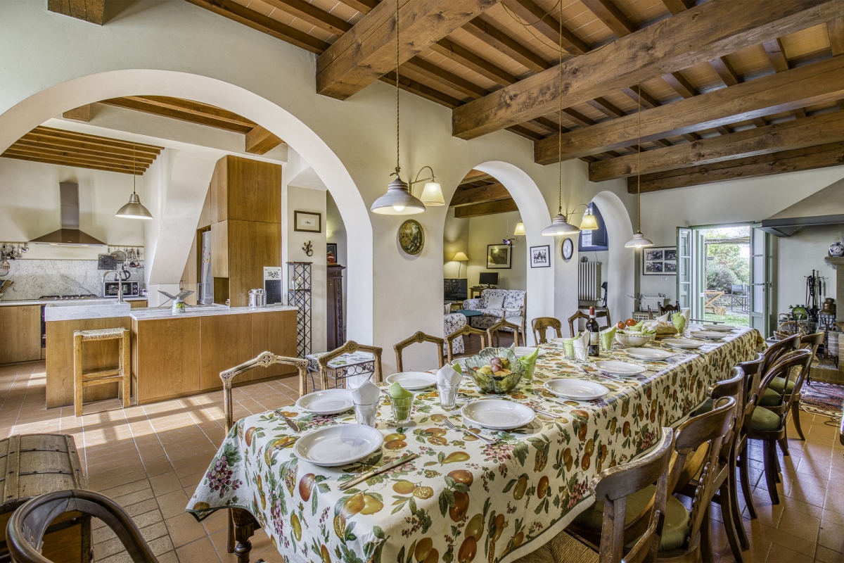 The apartment is one of 3 in the villa. The spacious living space is divided into 3 areas by elegant archways. The sitting room is furnished with two comfortable sofas, a flat-screen TV and various antique pieces. The dining area includes a large wooden dining table, which can seat up to 18 people and an open fireplace. The separate kitchen is equipped with a cooker hob, oven, microwave, dishwasher, Moka coffee maker and a fridge/freezer.